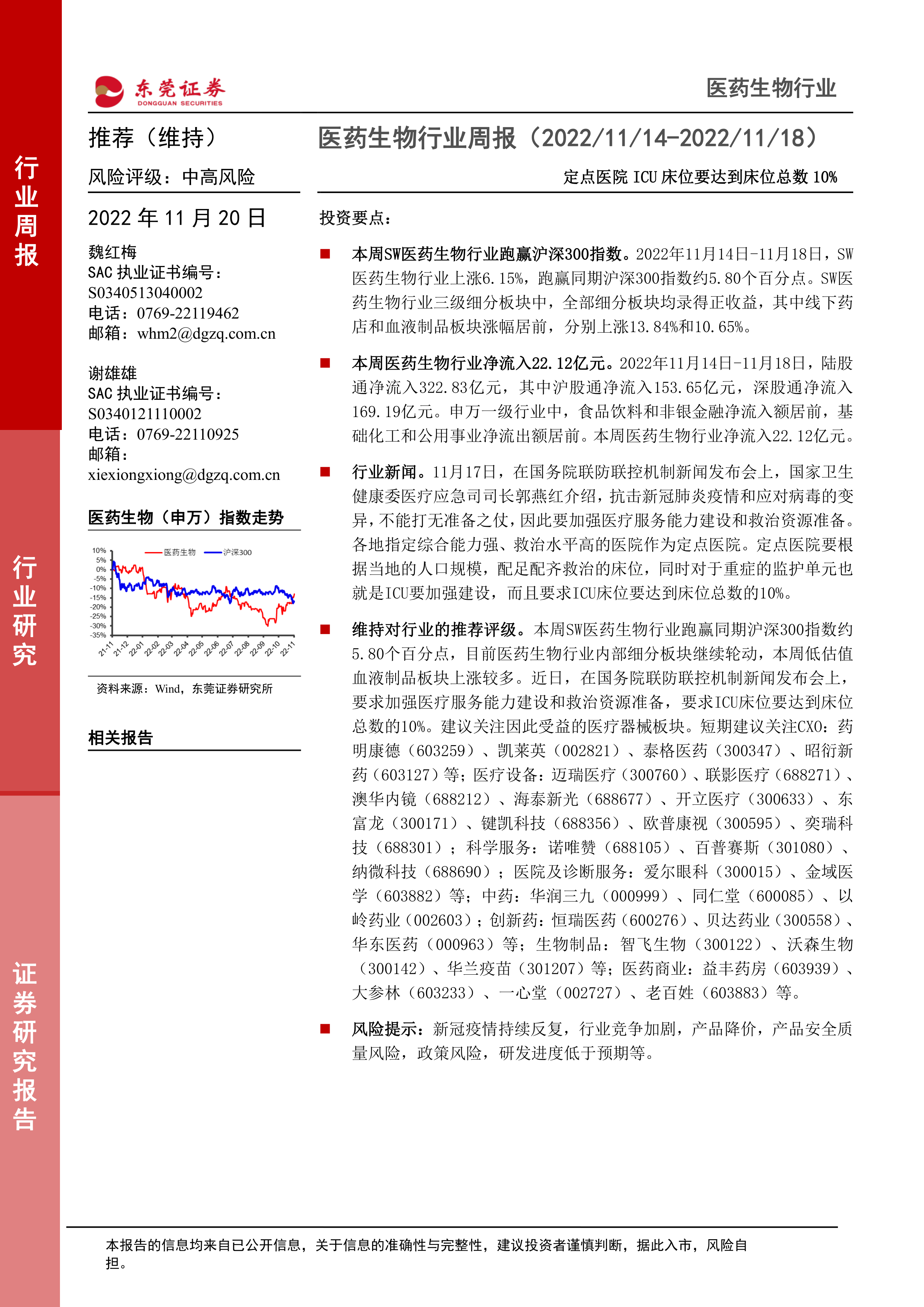 鉴于SW医药生物行业本周跑赢沪深300指数约5.80个百分点,且估值仍处于相对低位,维持对行业的推荐评级。政策要求加强医疗服务能力建设和ICU床位配置,建议关注因此受益的医疗器械板块。