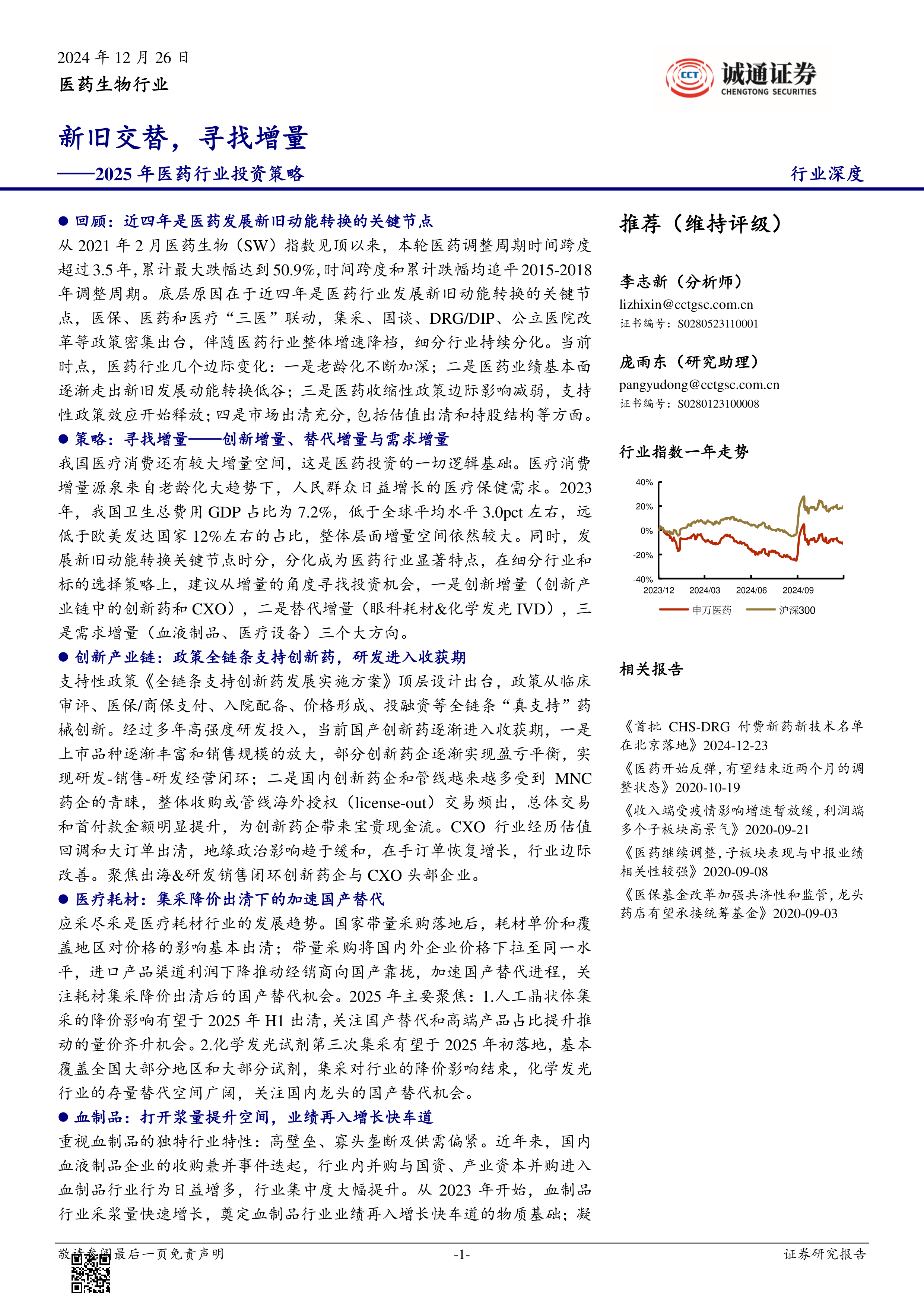 当前医药行业面临多重边际变化:老龄化深化带来医疗需求长逻辑稳固;医药业绩基本面逐步改善,营收增速重回正增长区间;收缩性政策影响减弱,支持性政策(如全链条支持创新药发展)效应开始释放;市场估值已处于十年周期底部,基金持仓降至历史低位,出清充分。在此背景下,报告建议投资者提升对医药行业的关注度,并重点布局创新药及CXO、国产替代加速的医疗耗材(如眼科耗材、化学发光IVD)、以及需求持续扩张的血液制品和医疗设备等细分领域。