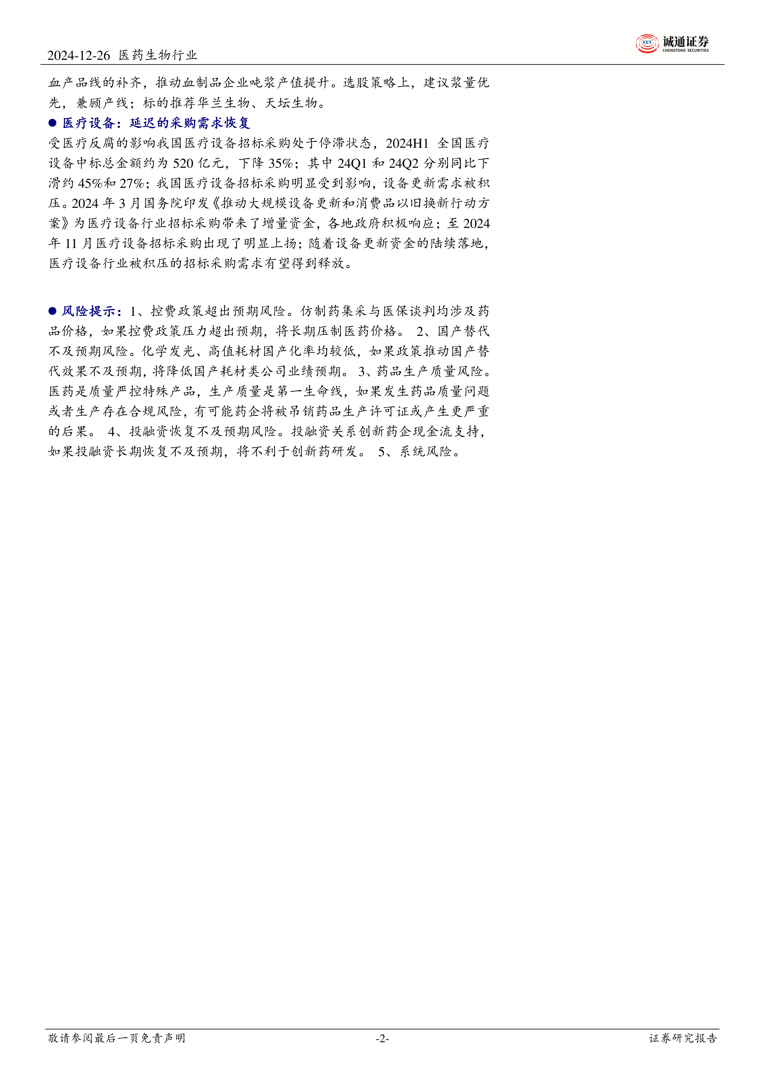 风险提示: 1、控费政策超出预期风险。仿制药集采与医保谈判均涉及药品价格,如果控费政策压力超出预期,将长期压制医药价格。 2、国产替代不及预期风险。化学发光、高值耗材国产化率均较低,如果政策推动国产替代效果不及预期,将降低国产耗材类公司业绩预期。 3、药品生产质量风险。医药是质量严控特殊产品,生产质量是第一生命线,如果发生药品质量问题或者生产存在合规风险,有可能药企将被吊销药品生产许可证或产生更严重的后果。 4、投融资恢复不及预期风险。投融资关系创新药企现金流支持,如果投融资长期恢复不及预期,将不利于创新药研发。 5、系统风险。