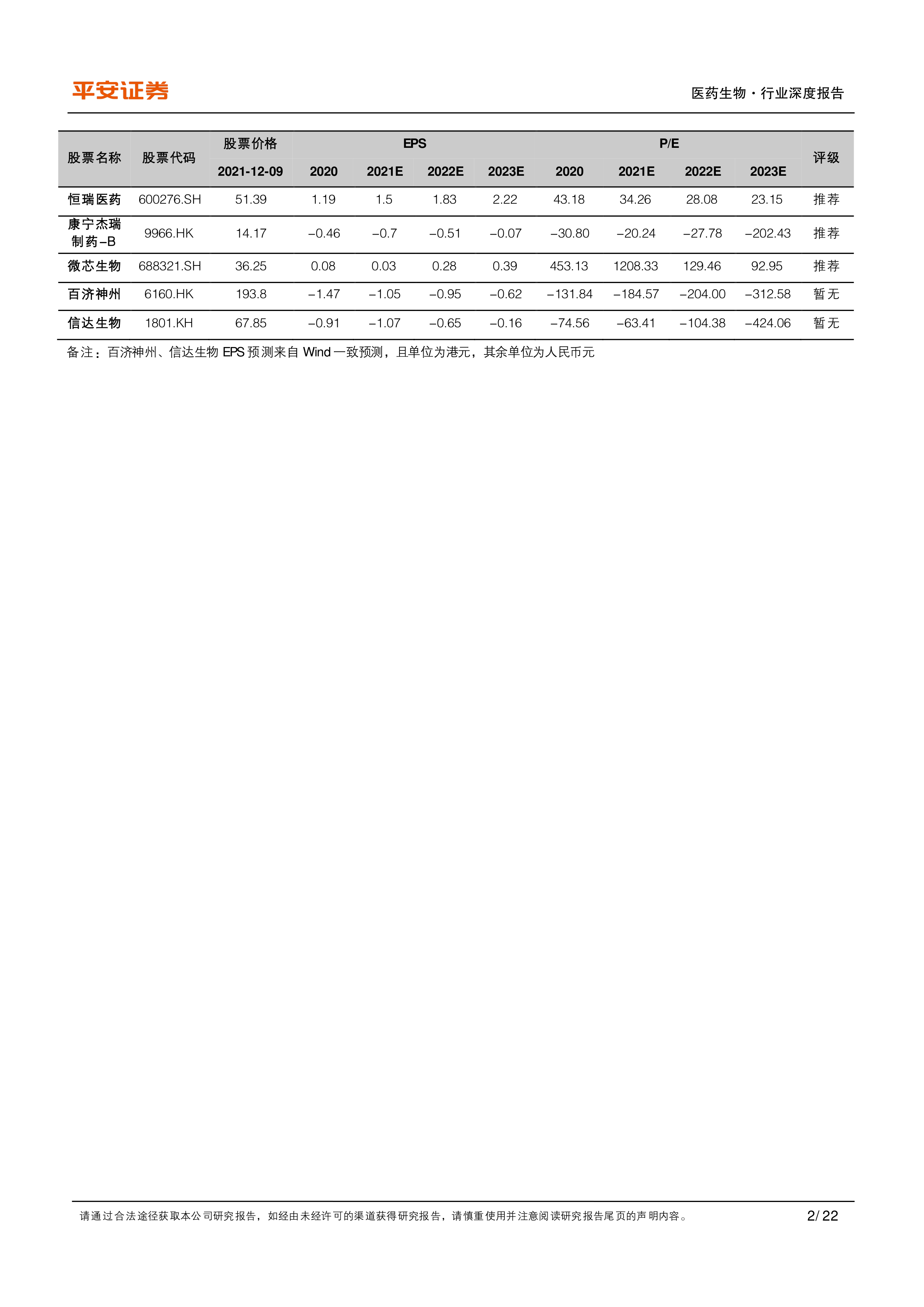 在二次洗牌阶段,应关注未来具有持续发展潜力的自主创新企业,以及具有较高临床价值和壁垒的创新药产品。我国创新研发正从me-too的1.0阶段升级到me-better/faster的2.0阶段,议价能力更强。国产创新药已初步获得国际认可,获得FDA特殊通道资格数量和License-out项目显著增长,部分产品和企业正迈出国门,走向全球市场。2021年7月CDE新政将加速行业分化,建议关注具备临床导向创新能力和License-out能力的公司,如恒瑞医药、百济神州、信达生物、康宁杰瑞、微芯生物等。
