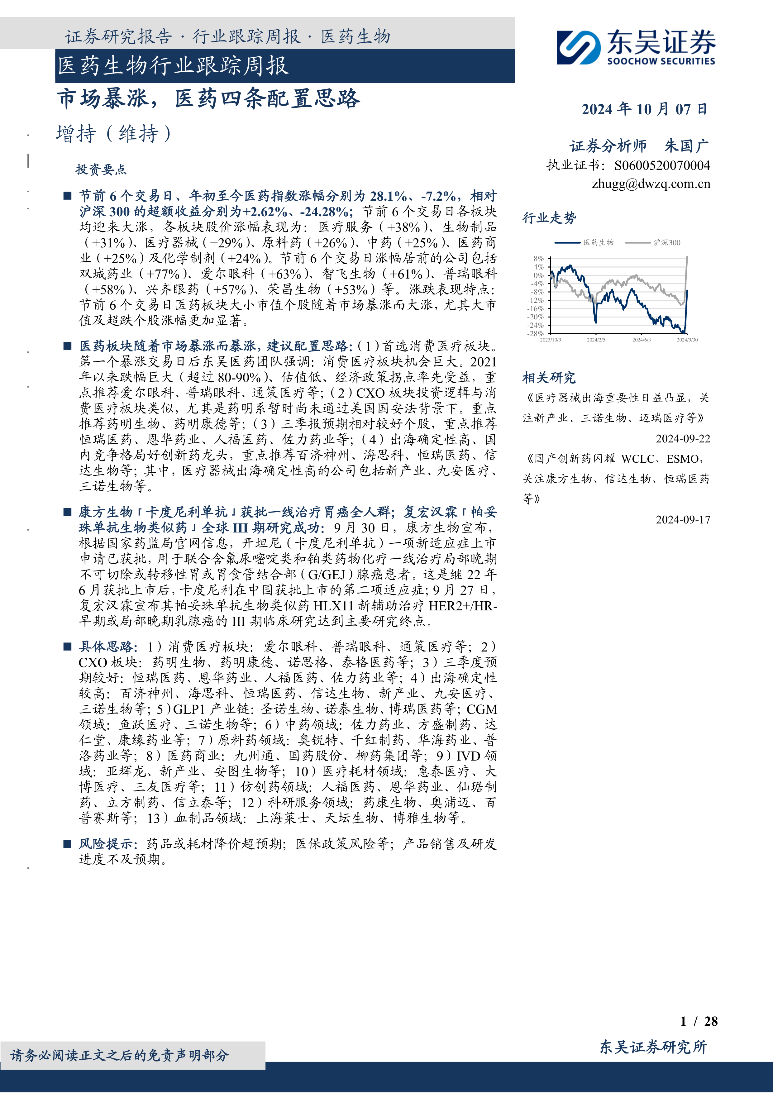 本报告深入分析了2024年10月医药生物行业的市场表现与投资策略。在近期市场整体暴涨的带动下,医药板块迎来显著反弹,但年初至今的超额亏损表明其估值仍处于相对低位,具备修复潜力。宏观经济利好政策的落地为行业提供了积极的外部环境。