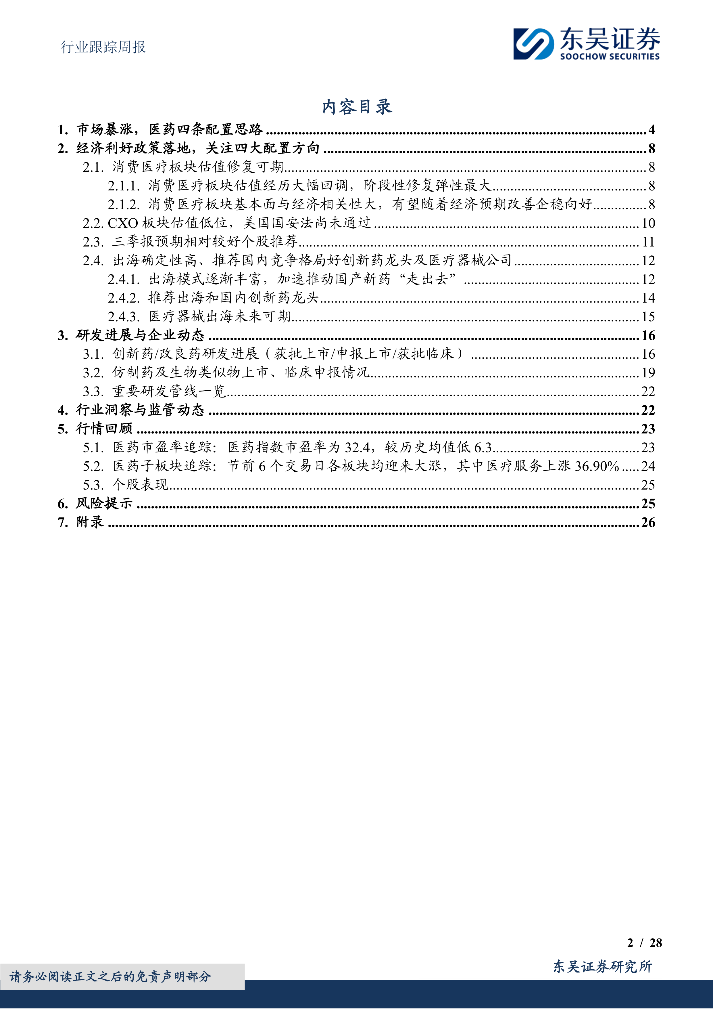 医药板块随着市场暴涨而暴涨,建议配置思路:(1)首选消费医疗板块。第一个暴涨交易日后东吴医药团队强调:消费医疗板块机会巨大。2021年以来跌幅巨大(超过80-90%)、估值低、经济政策拐点率先受益,重点推荐爱尔眼科、普瑞眼科、通策医疗等;(2)CXO板块投资逻辑与消费医疗板块类似,尤其是药明系暂时尚未通过美国国安法背景下。重点推荐药明生物、药明康德等;(3)三季报预期相对较好个股,重点推荐恒瑞医药、恩华药业、人福医药、佐力药业等;(4)出海确定性高、国内竞争格局好创新药龙头,重点推荐百济神州、海思科、恒瑞医药、信达生物等;其中,医疗器械出海确定性高的公司包括新产业、九安医疗、三诺生物等。