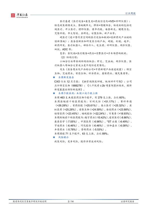 本周医药生物板块整体上涨,创新药领域表现突出,尤其是在医保谈判的背景下,具有FIC潜力且临床领先的标的备受关注。报告强调,在关注创新药的同时,更应重视那些已经实现商业化并快速放量的产品,因为这些公司具有更高的投资确定性。此外,报告还对CXO行业和特宝生物进行了分析,并对A股和港股的个股表现进行了总结。投资者应关注政策风险、竞争风险和股价异常波动风险。