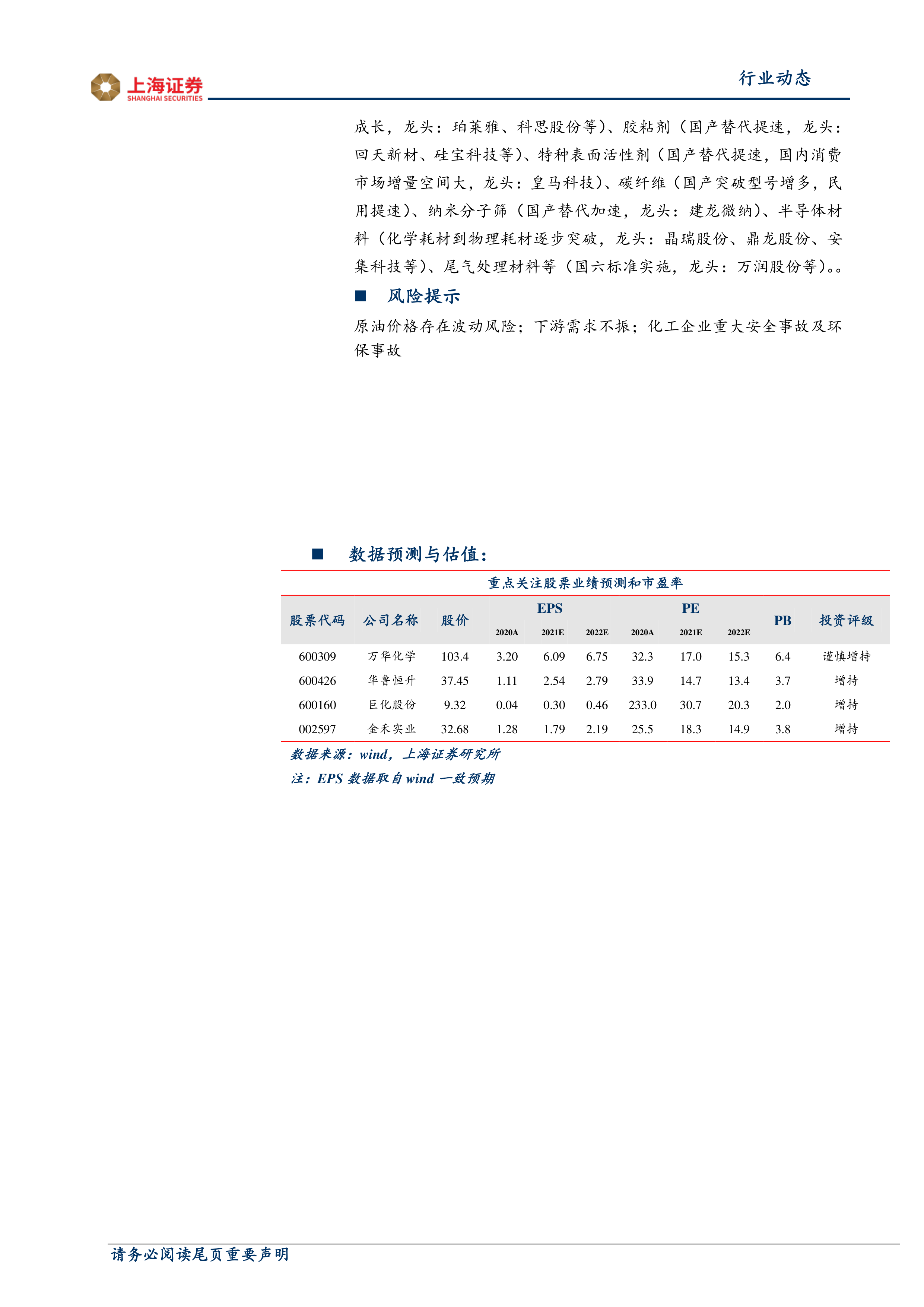 周期方面,基于通胀预期及行业β趋势向好逐步兑现,企业估值提升明显,尽管近期有所回调,但我们仍然建议关注顺周期中α属性强的龙头企业(万华化学、华鲁恒升、扬农化工、新和成等)以及部分前期受关注较低的优质企业(巨化股份),此外,油价后期有望提升,可关注油价中枢提升受益的烯烃龙头(宝丰能源、卫星石化等)、化纤板块(新凤鸣等)及高能耗炭黑行业(黑猫股份等)。