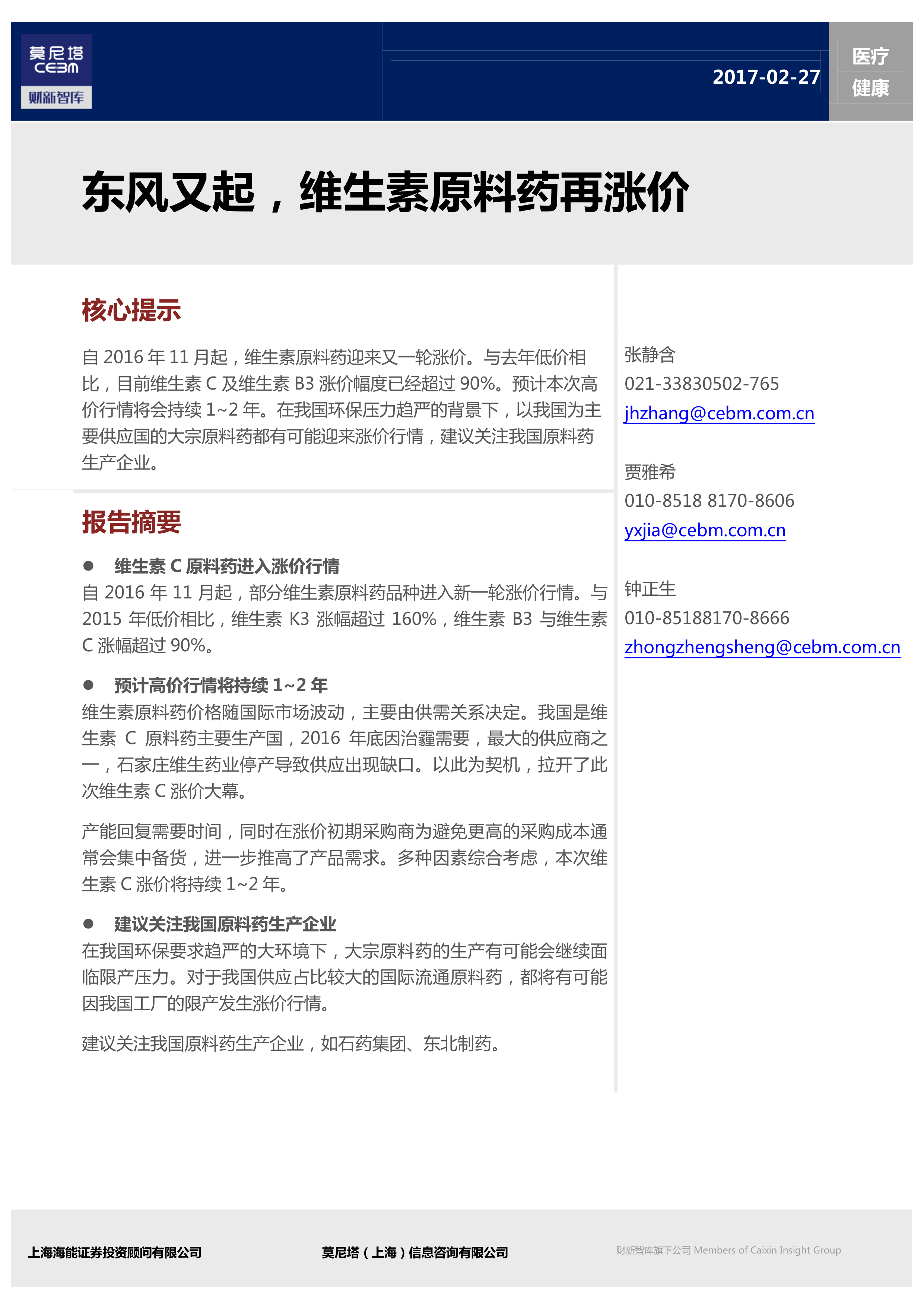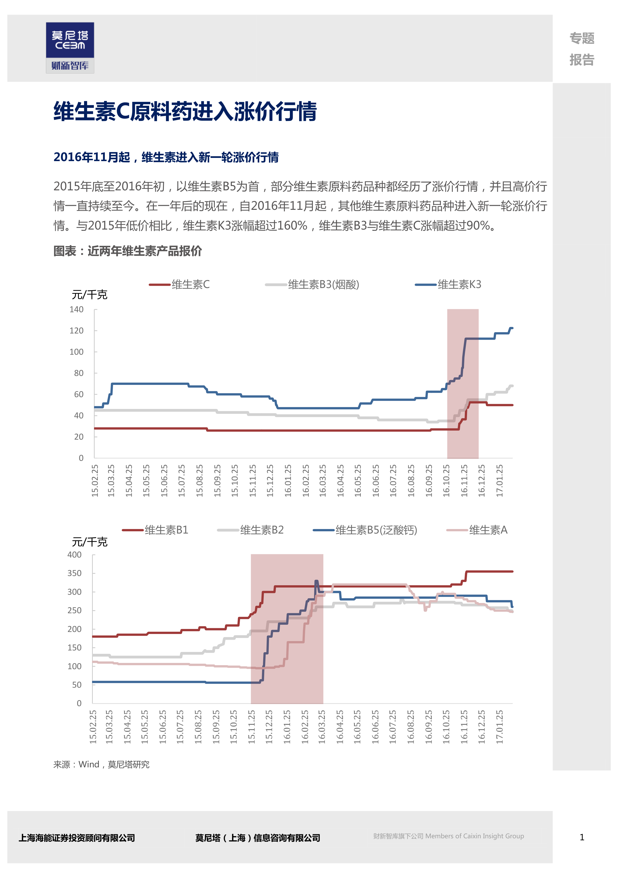 本报告分析了自2016年11月起维生素原料药的涨价行情,并预测了未来1-2年的市场趋势。报告强调了环保政策趋严对原料药生产的影响,并提出了投资建议。