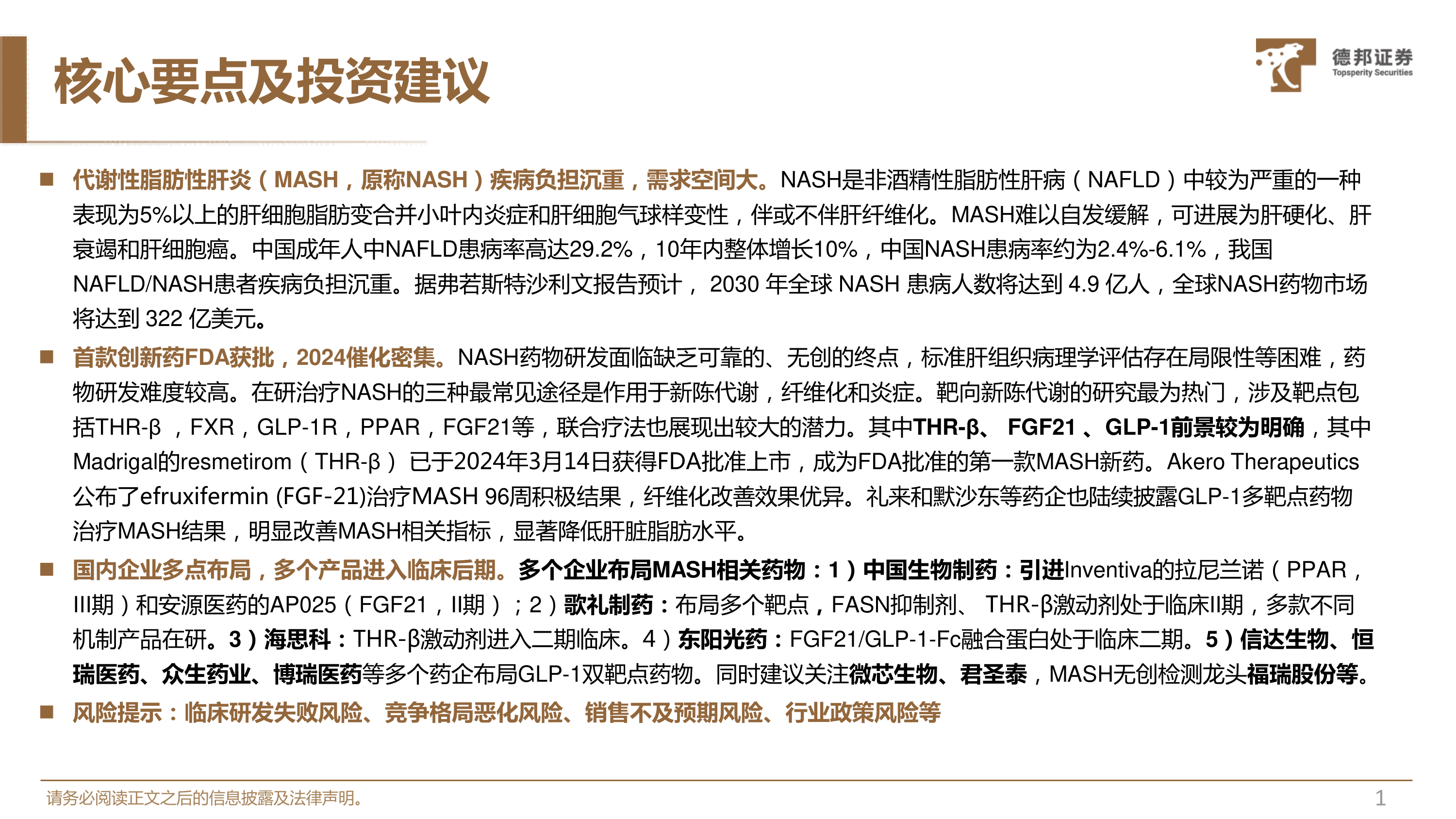 代谢性脂肪性肝炎(MASH,原称NASH)疾病负担沉重,需求空间大。NASH是非酒精性脂肪性肝病(NAFLD)中较为严重的一种表现为5%以上的肝细胞脂肪变合并小叶内炎症和肝细胞气球样变性,伴或不伴肝纤维化。MASH难以自发缓解,可进展为肝硬化、肝衰竭和肝细胞癌。中国成年人中NAFLD患病率高达29.2%,10年内整体增长10%,中国NASH患病率约为2.4%-6.1%,我国NAFLD/NASH患者疾病负担沉重。据弗若斯特沙利文报告预计,2030年全球NASH患病人数将达到4.9亿人,全球NASH药物市场将达到322亿美元。