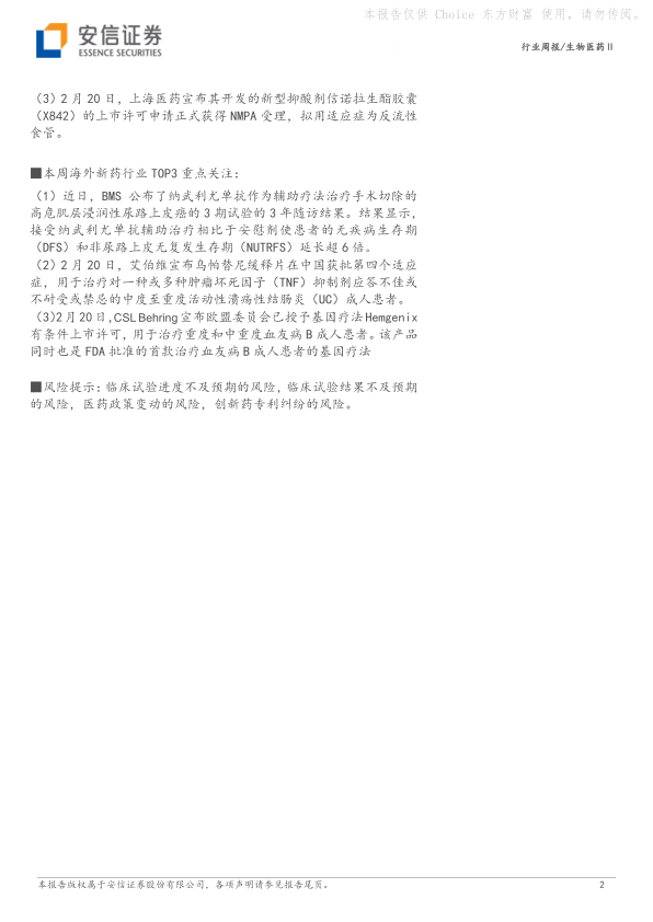 (3)2月20日,上海医药宣布其开发的新型抑酸剂信诺拉生酯胶囊(X842)的上市许可申请正式获得NMPA受理,拟用适应症为反流性食管。