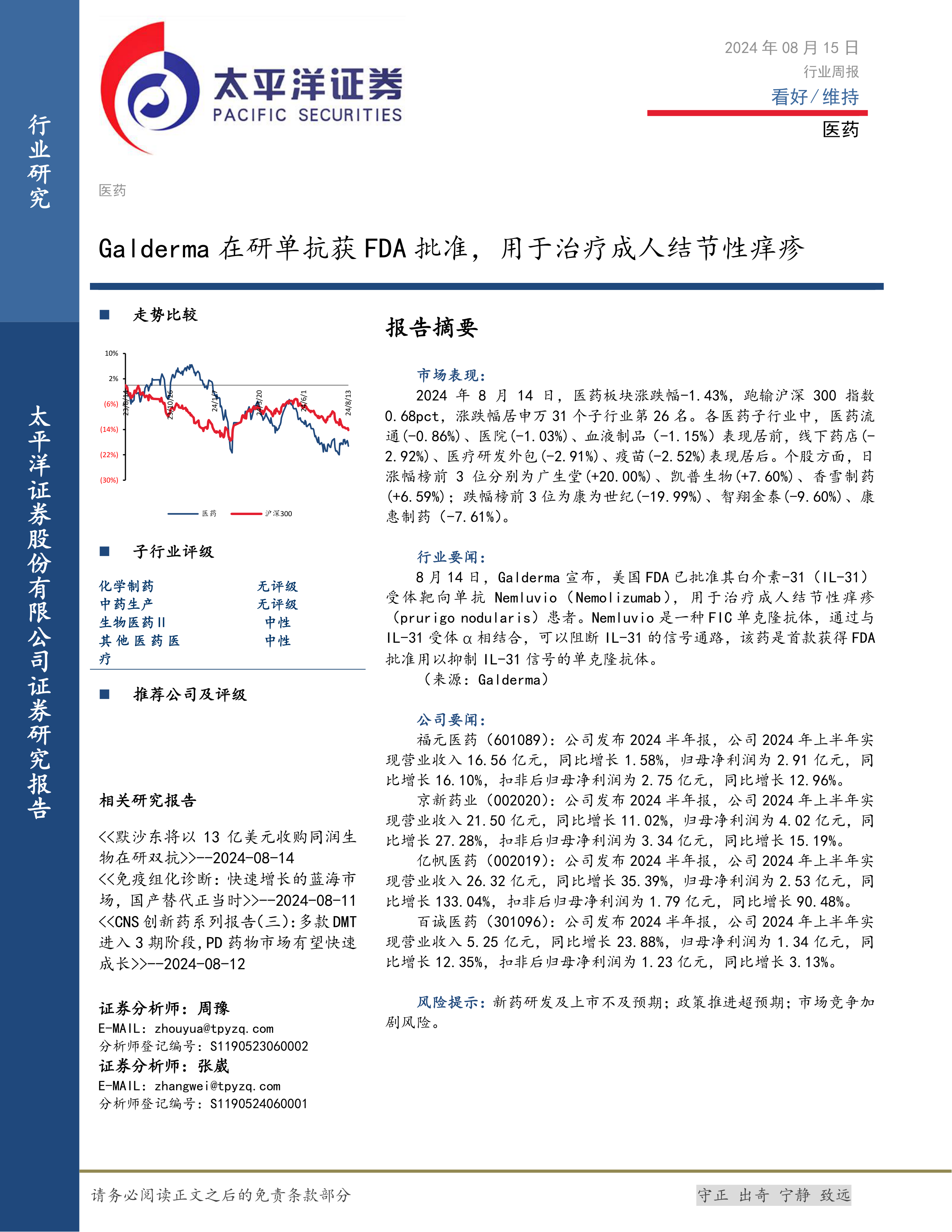 本周医药生物板块整体表现不佳,跑输沪深300指数,子行业和个股表现分化明显。Galderma单抗获批为结节性痒疹治疗带来新希望。多家医药上市公司发布半年报,业绩表现各有亮点。投资者应关注医药行业结构性调整和创新药研发进展,以及公司基本面变化。