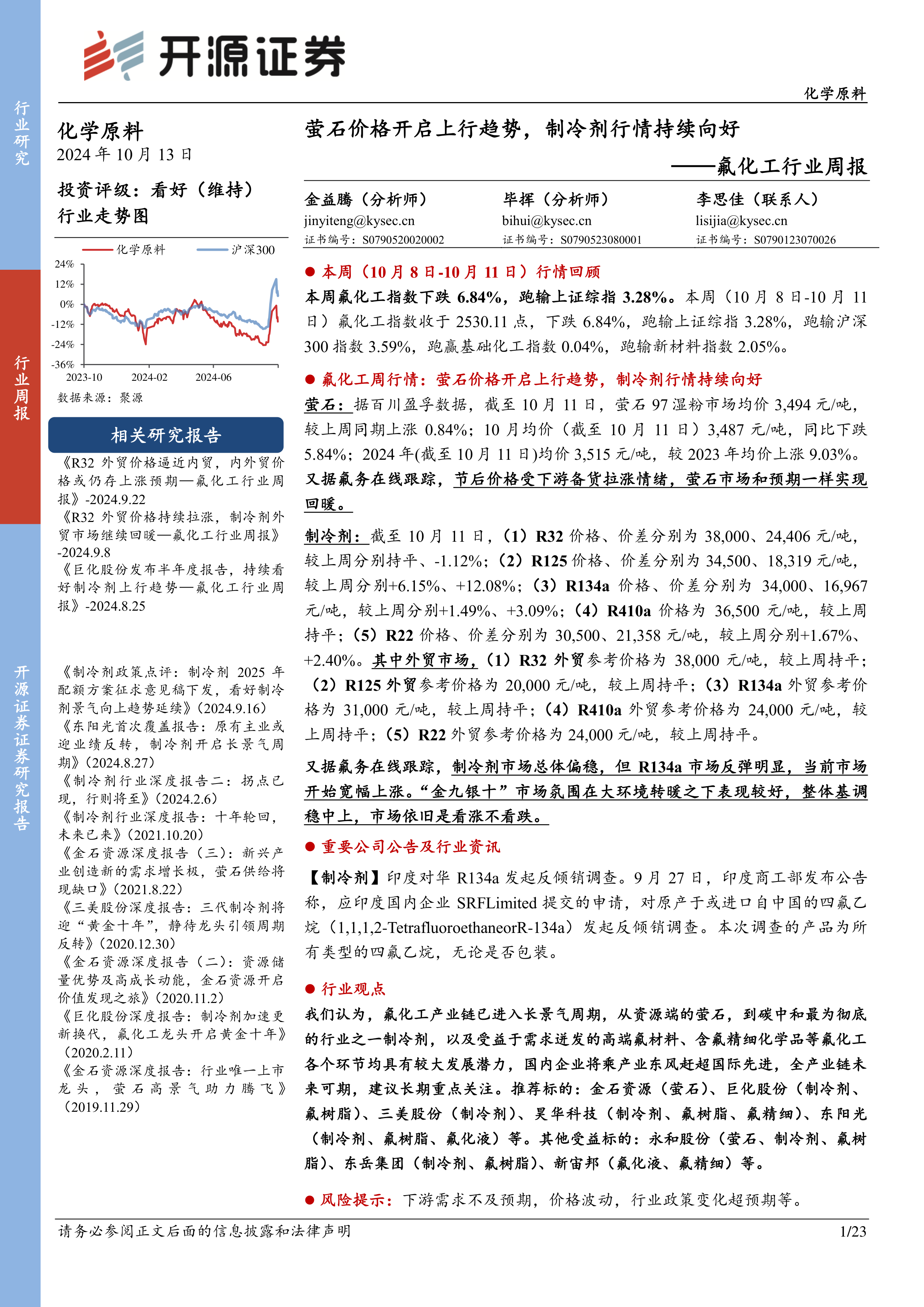 氟化工行业周报:萤石价格开启上行趋势,制冷剂行情持续向好