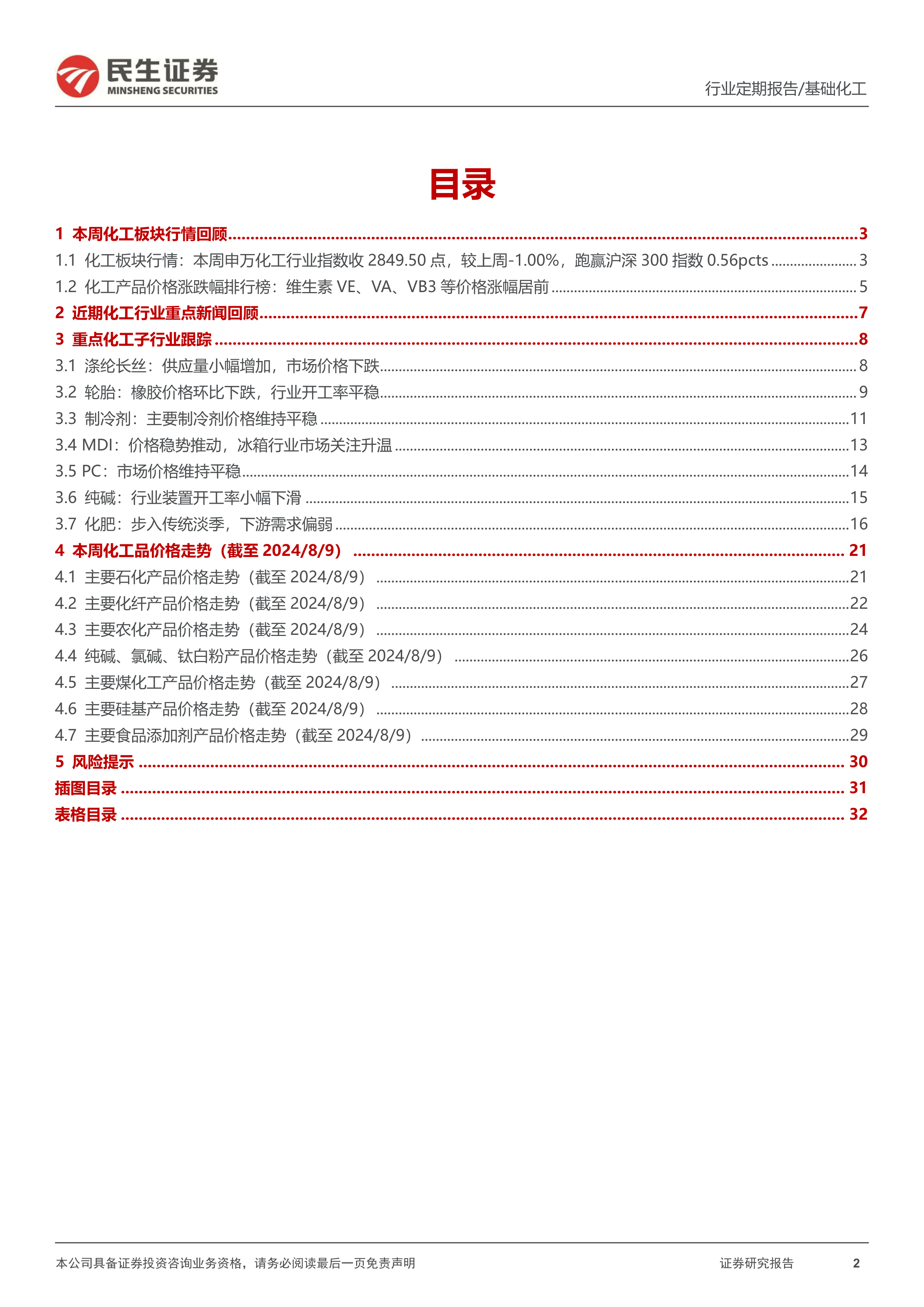 本周(2024年8月5日至2024年8月11日)化工行业整体呈现景气度分化态势。在传统淡季背景下,粘胶短纤和涤纶长丝等子行业通过提价验证了供需平衡的显著改善,显示出较强的市场韧性。同时,国家政策对大规模设备更新和消费品以旧换新的支持,为制冷剂、MDI等相关板块带来了需求刺激预期。供给端变动,特别是巴斯夫工厂爆炸事件,对维生素VA、VE等产品价格形成显著支撑,导致其涨幅居前。此外,中国资源循环集团的筹备成立,标志着再生资源利用计划的进一步深化,预示着行业结构性变革的加速。