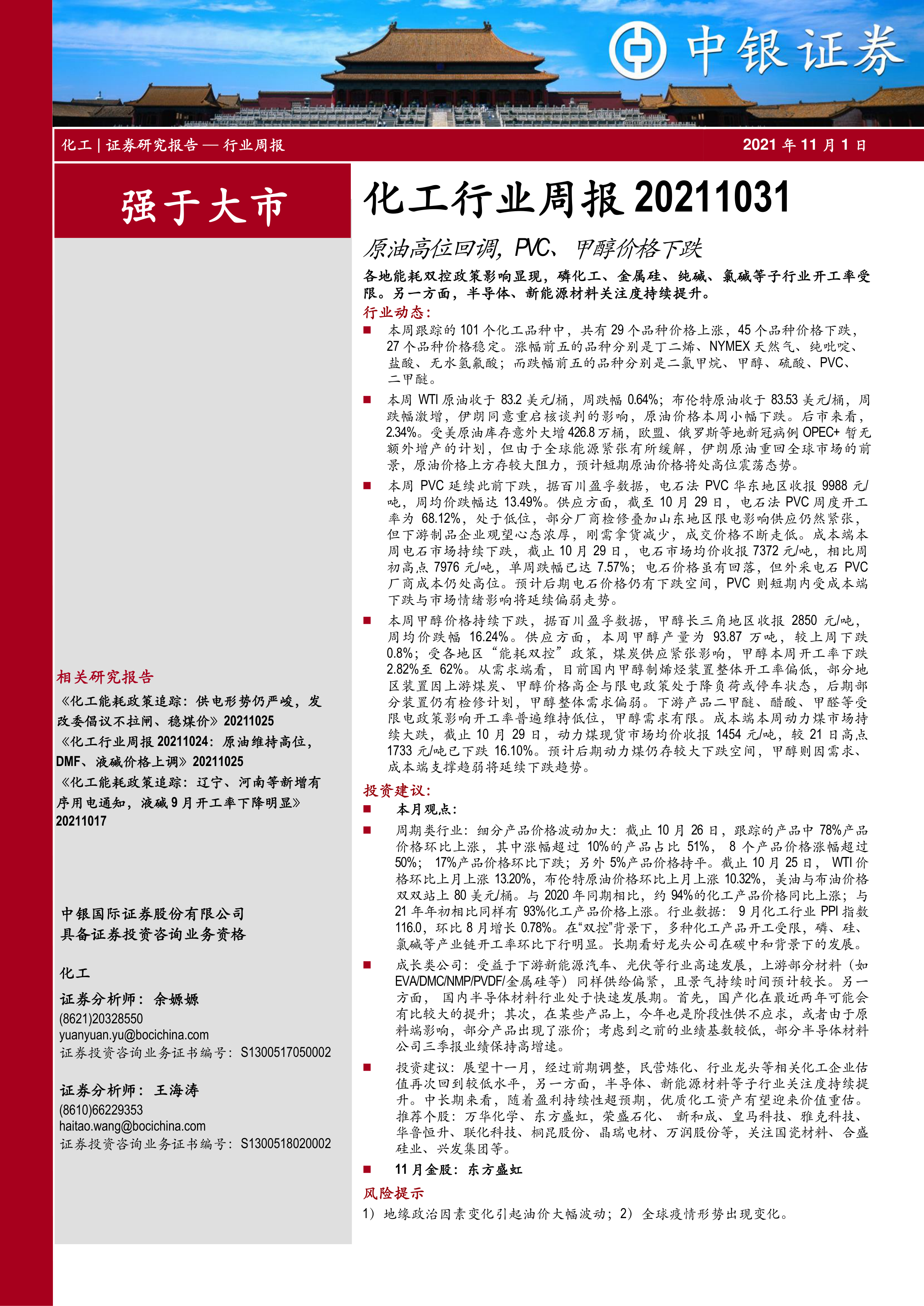 投资建议:展望十一月,经过前期调整,民营炼化、行业龙头等相关化工企业估值再次回到较低水平,另一方面,半导体、新能源材料等子行业关注度持续提升。中长期来看,随着盈利持续性超预期,优质化工资产有望迎来价值重估。推荐个股:万华化学、东方盛虹,荣盛石化、新和成、皇马科技、雅克科技、华鲁恒升、联化科技、桐昆股份、晶瑞电材、万润股份等,关注国瓷材料、合盛硅业、兴发集团等。