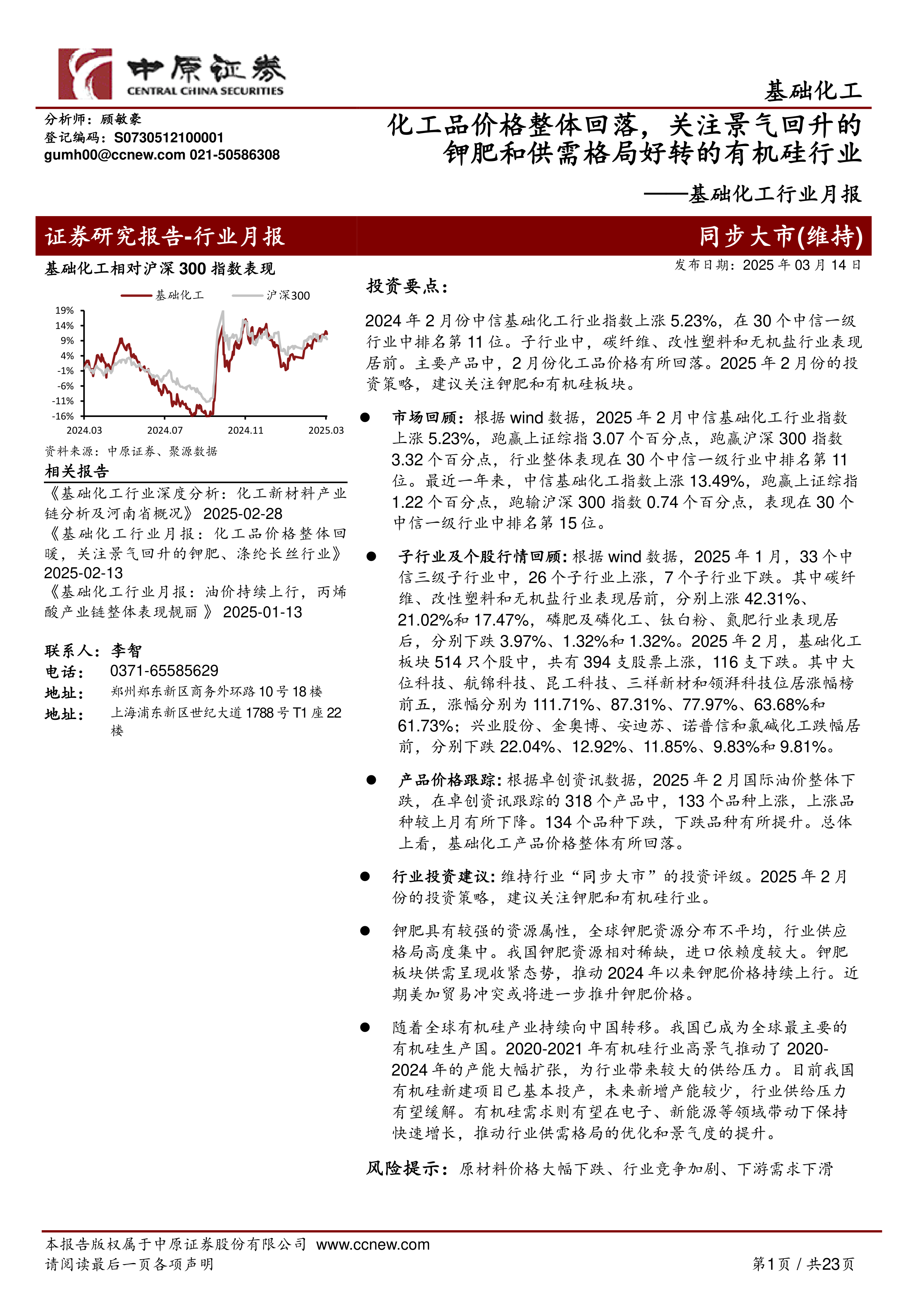 行业投资建议:维持行业“同步大市”的投资评级。2025年2月份的投资策略,建议关注钾肥和有机硅行业。