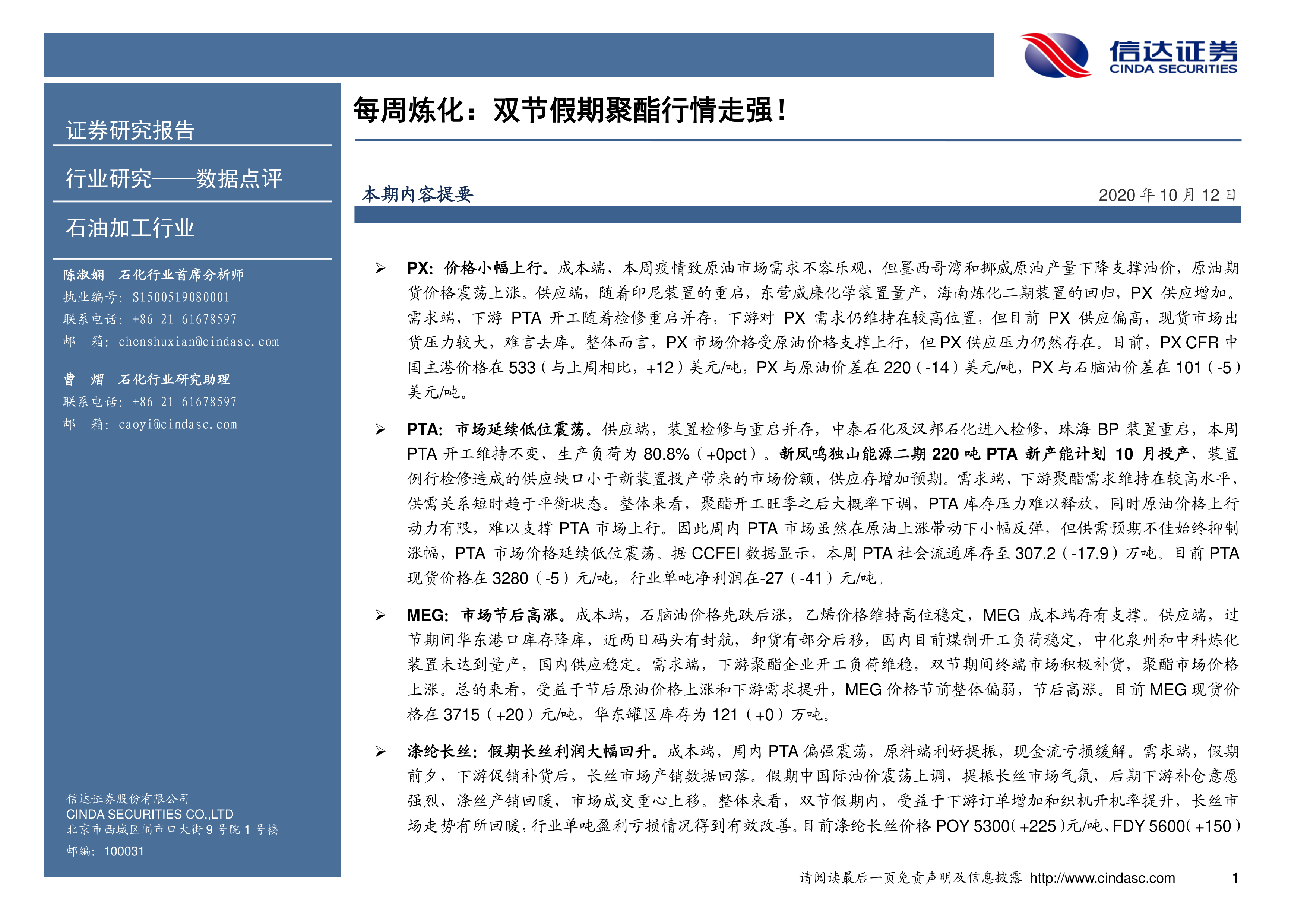 石油加工行业每周炼化:双节假期聚酯行情走强!