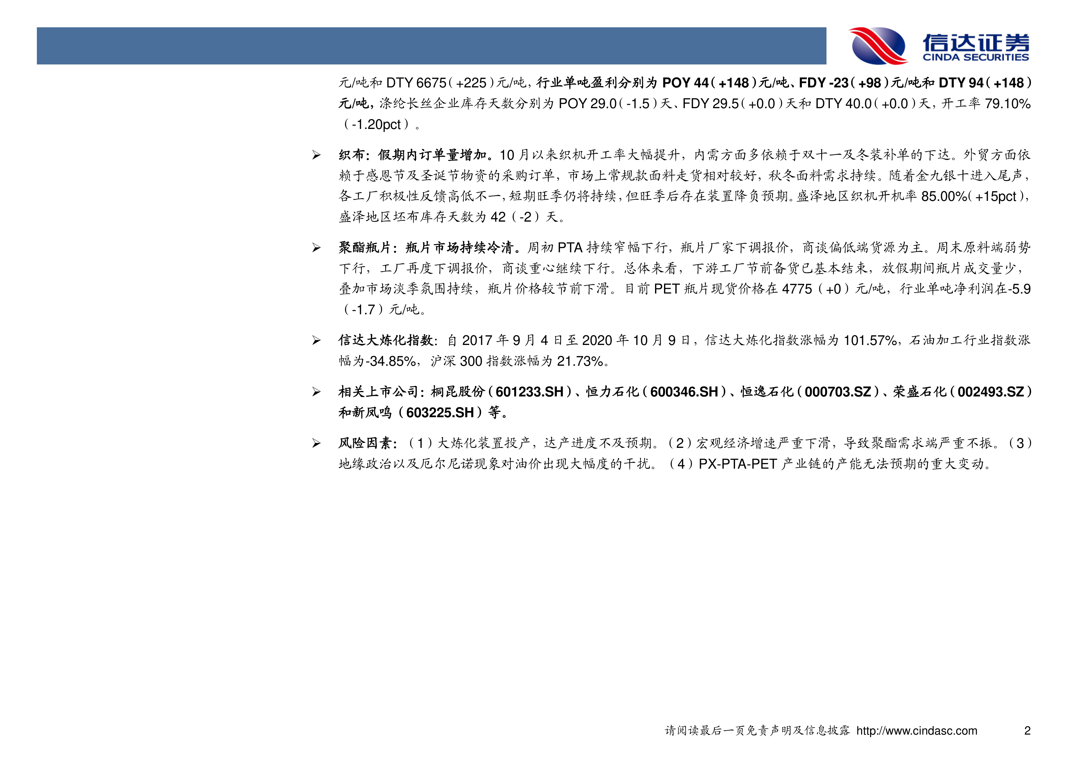 双节假期后,炼化及聚酯产业链市场呈现出复杂且分化的局面。MEG和涤纶长丝受益于原油价格上涨和下游补货需求,市场表现强劲,盈利能力显著改善。特别是涤纶长丝,在国际油价提振和下游补仓意愿强烈下,产销回暖,POY和DTY实现盈利。织布行业也因订单增加和开工率提升而保持旺盛。然而,PX和PTA市场则面临供应增加、库存压力和盈利承压的挑战,尽管原油提供一定支撑,但整体仍处于低位震荡。聚酯瓶片市场则因需求疲软和淡季氛围而持续冷清。信达大炼化指数的优异表现凸显了大型炼化一体化项目的长期价值,但投资者仍需警惕大炼化装置投产进度、宏观经济下行、油价波动以及产业链产能变动等多重风险因素。