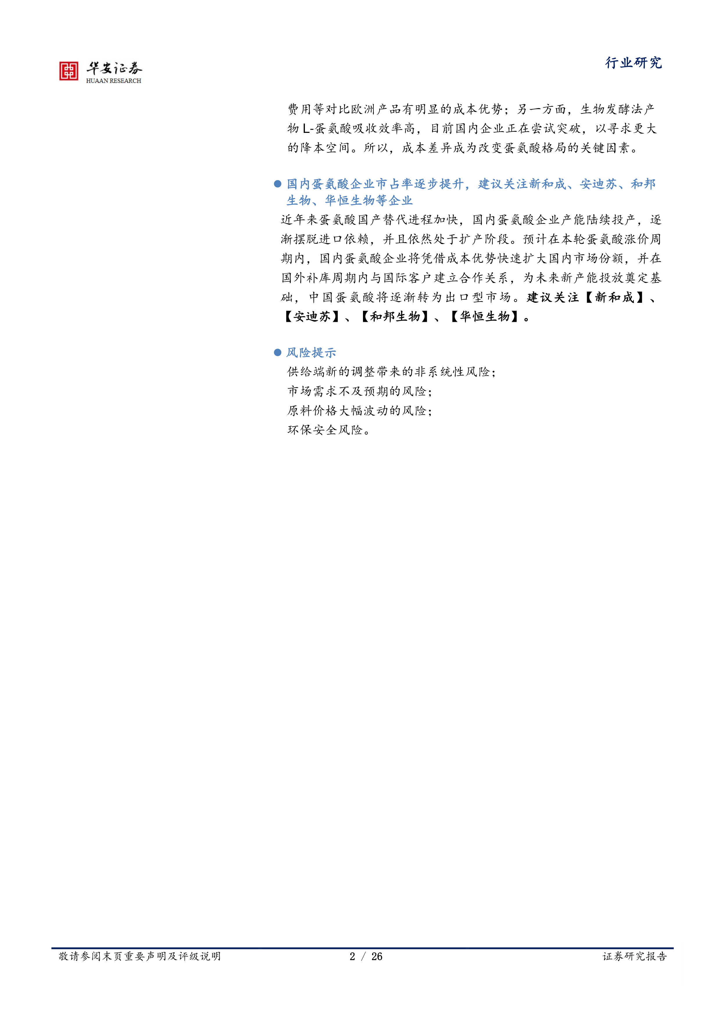 最后,报告建议投资者关注新和成、安迪苏、和邦生物、华恒生物等在蛋氨酸领域具有显著竞争优势和发展潜力的国内企业。报告也提示了供给端新的调整、市场需求不及预期、原料价格大幅波动以及环保安全等潜在风险。