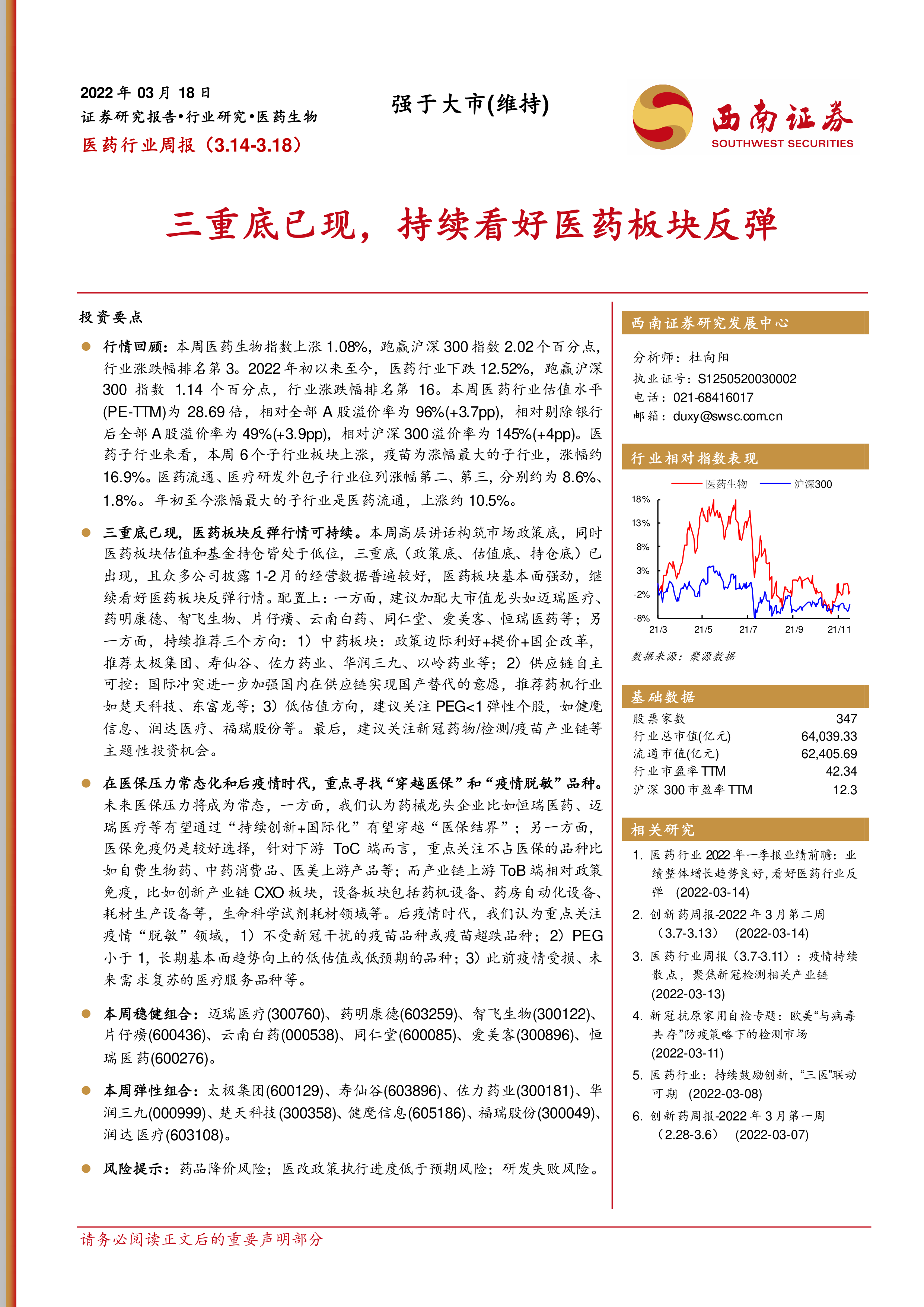 医药行业周报:三重底已现,持续看好医药板块反弹