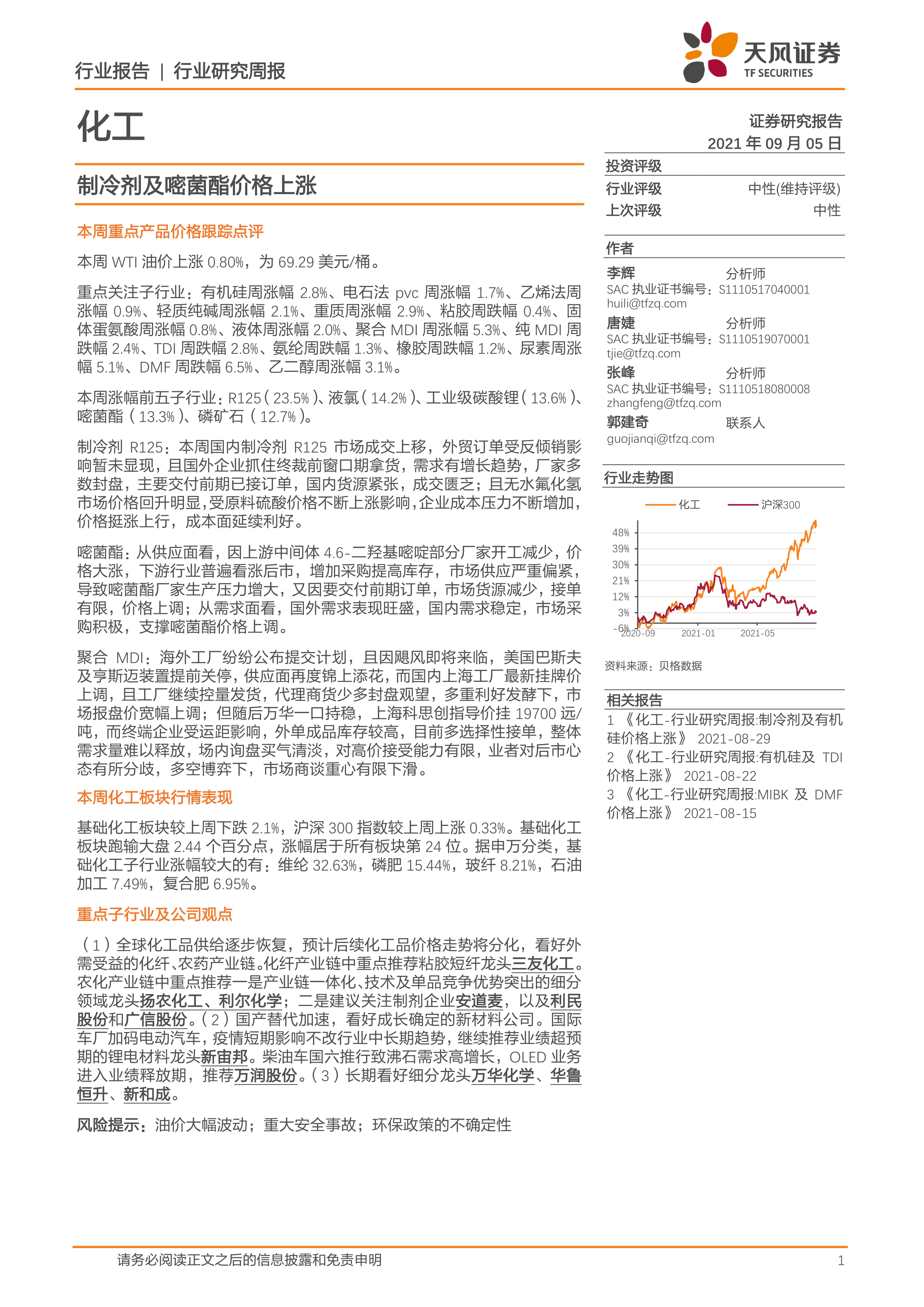 化工行业研究周报:制冷剂及嘧菌酯价格上涨