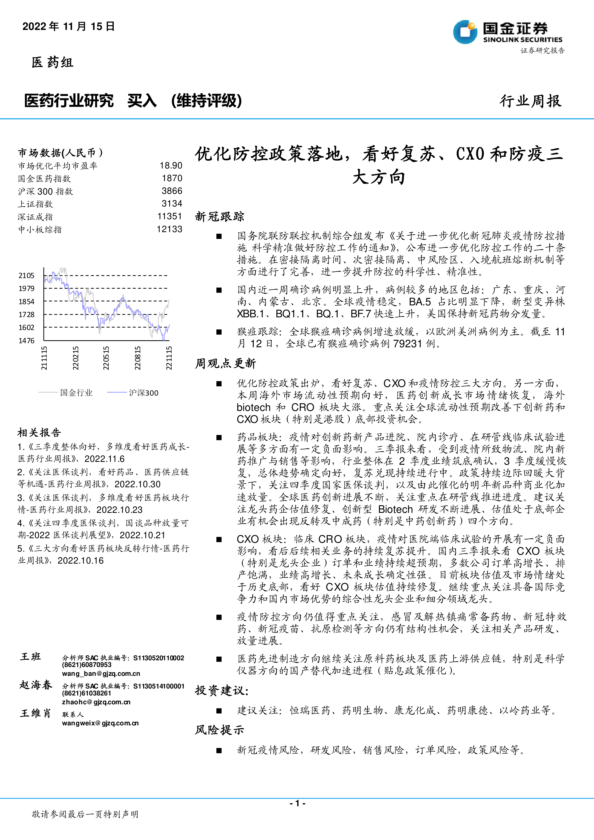 医药行业周报:优化防控政策落地,看好复苏、CXO和防疫三大方向