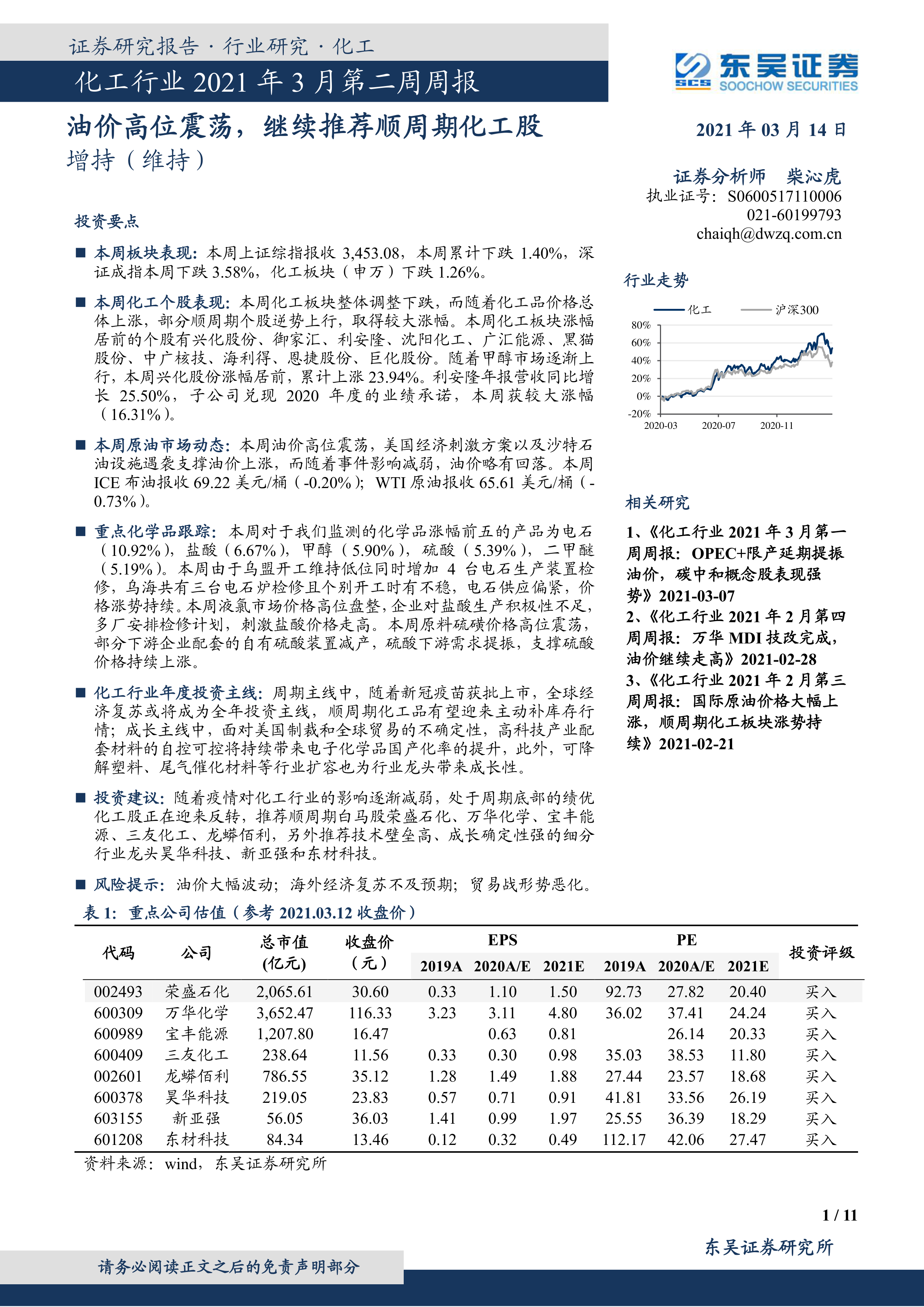 化工行业2021年3月第二周周报:油价高位震荡,继续推荐顺周期化工股