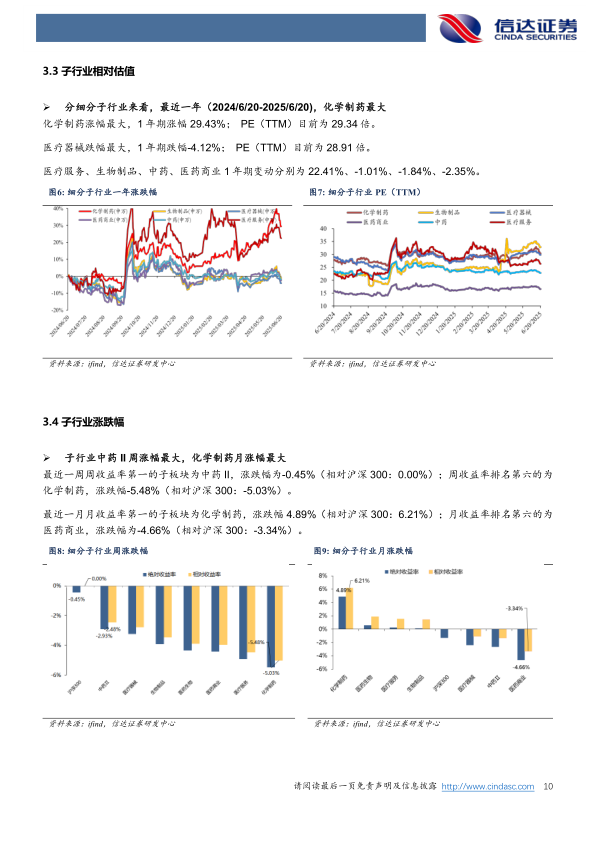 分细分子行业来看,最近一年(2024/6/20-2025/6/20),化学制药涨幅最大,为29.43%,PE(TTM)为29.34倍。医疗器械跌幅最大,为-4.12%,PE(TTM)为28.91倍。医疗服务、生物制品、中药、医药商业一年期变动分别为22.41%、-1.01%、-1.84%、-2.35%。