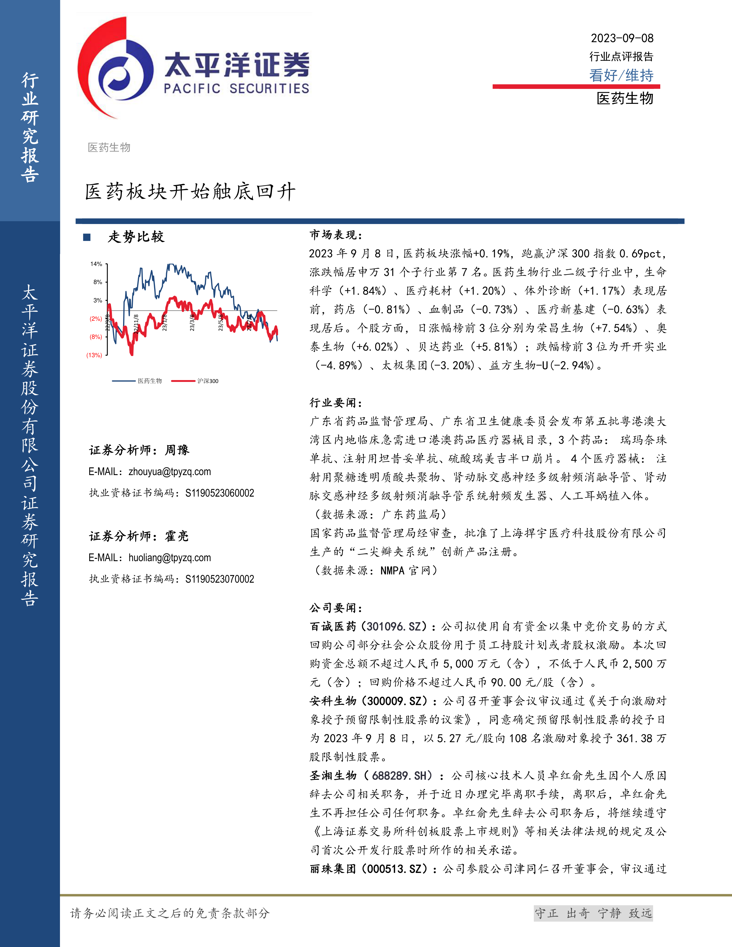 本报告对2023年9月8日医药生物行业的市场表现、行业要闻和公司动态进行了分析。医药板块整体呈现触底回升的态势,部分子行业和个股表现突出。政策方面,粤港澳大湾区临床急需药品器械目录的更新以及创新医疗器械的获批,为行业发展注入了新的动力。公司动态方面,多家公司在股权激励、人事变动等方面有所调整。投资者应关注行业政策变化、公司经营状况以及市场风险,做出理性投资决策。