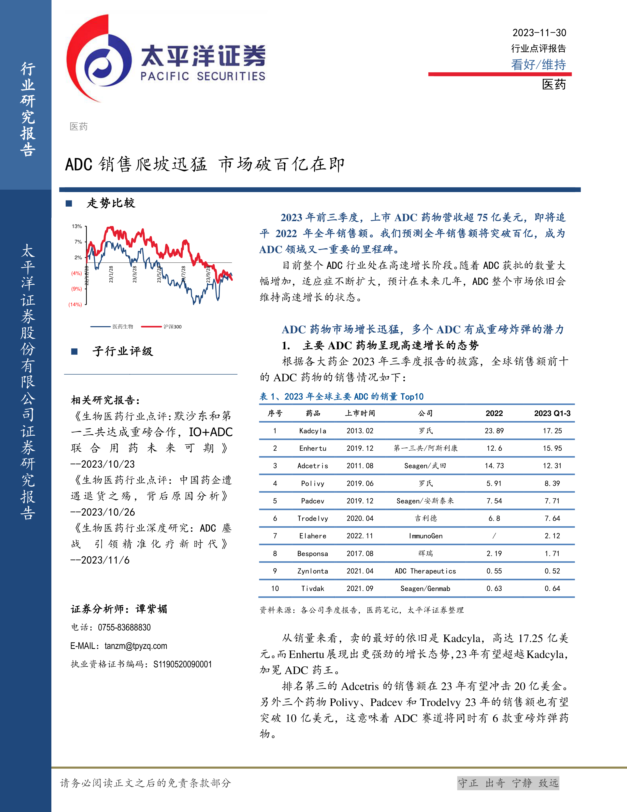 医药行业点评报告:ADC销售爬坡迅猛 市场破百亿在即