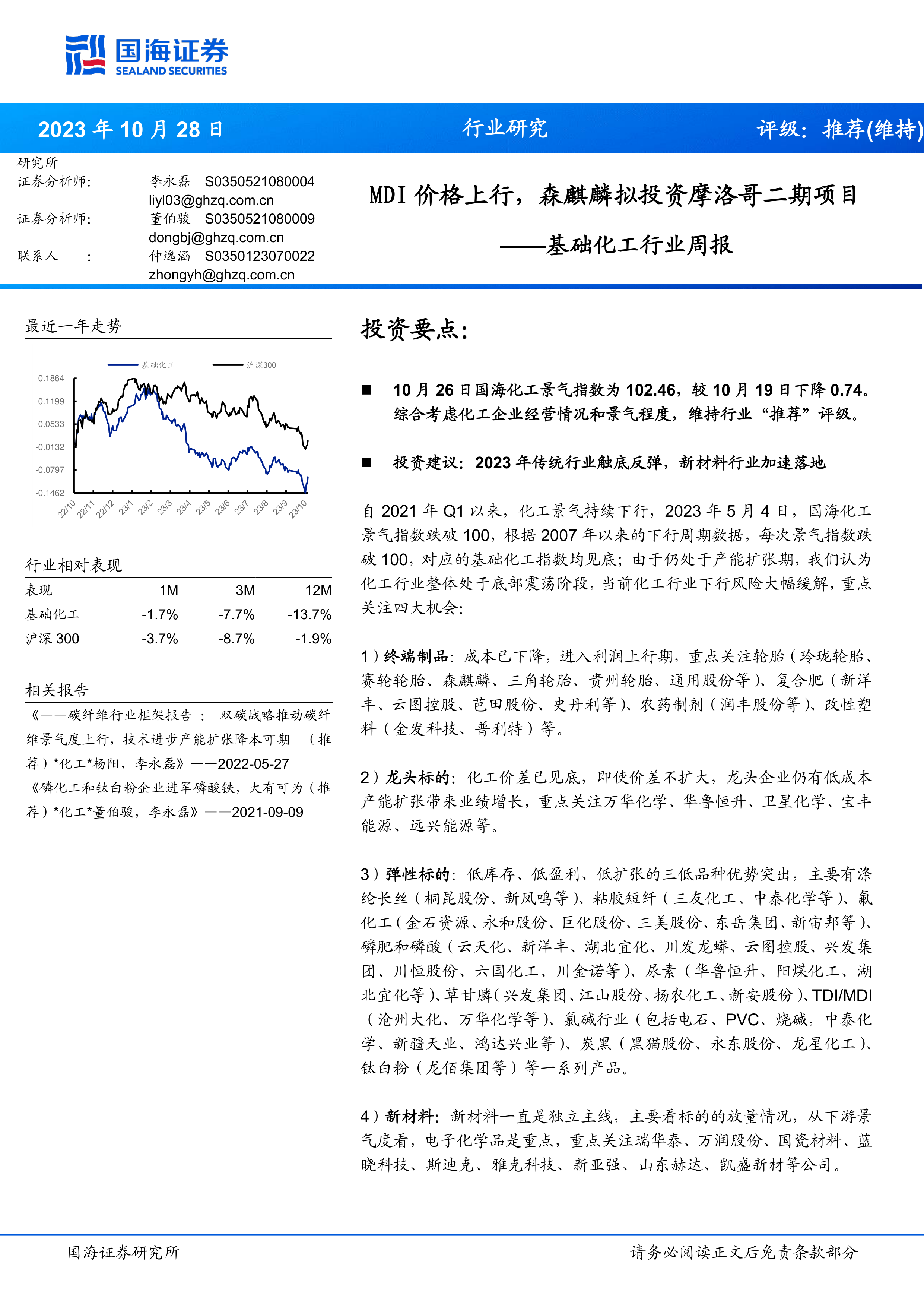 2023年以来,化工行业景气度持续下行后触底反弹,国海化工景气指数虽有小幅波动,但整体行业下行风险大幅缓解。本报告维持行业“推荐”评级,并强调应重点关注终端制品、龙头标的、弹性标的及新材料四大投资机会,以把握行业底部震荡后的结构性增长。
