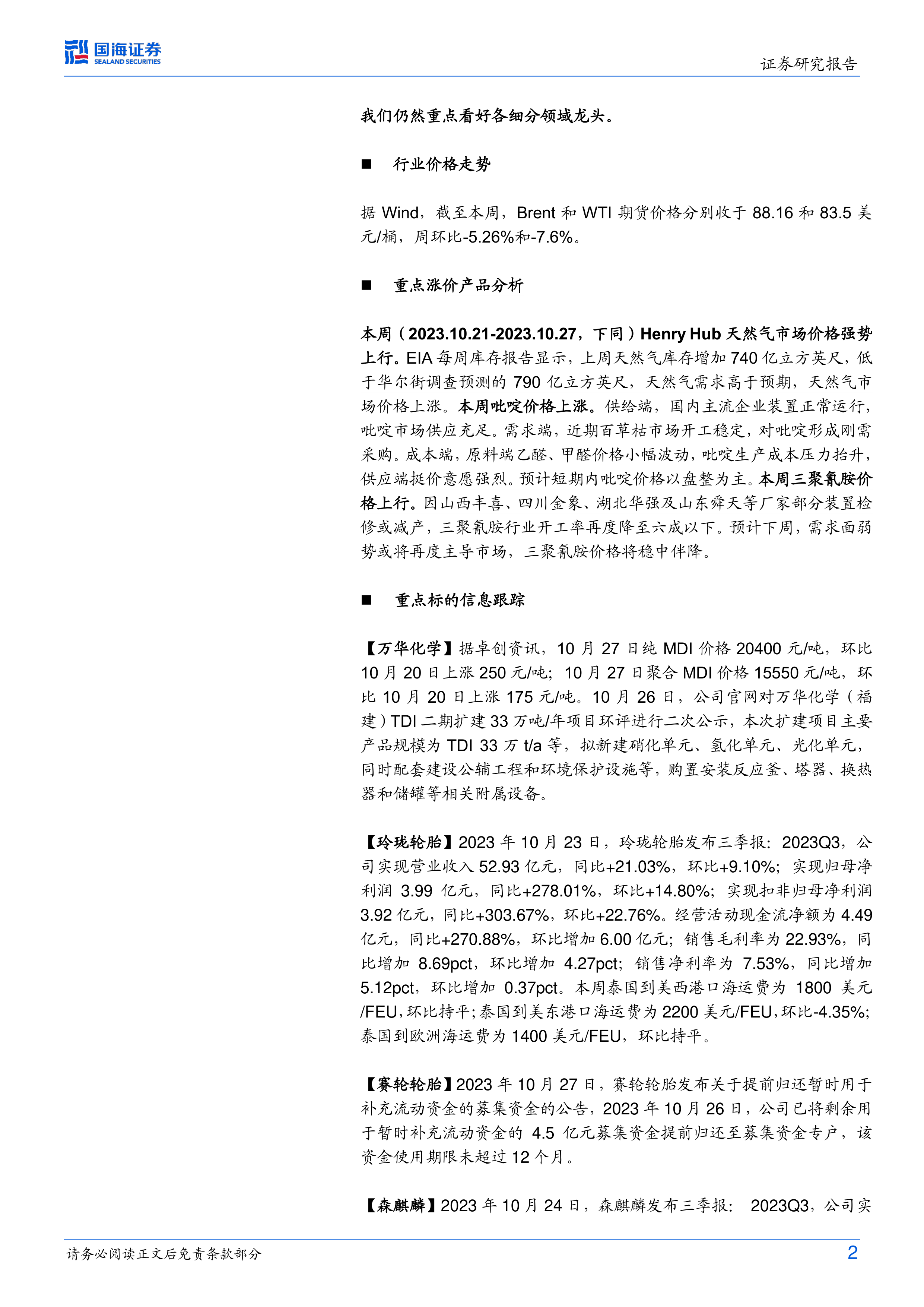 基础化工行业周报:MDI价格上行,森麒麟拟投资摩洛哥二期项目