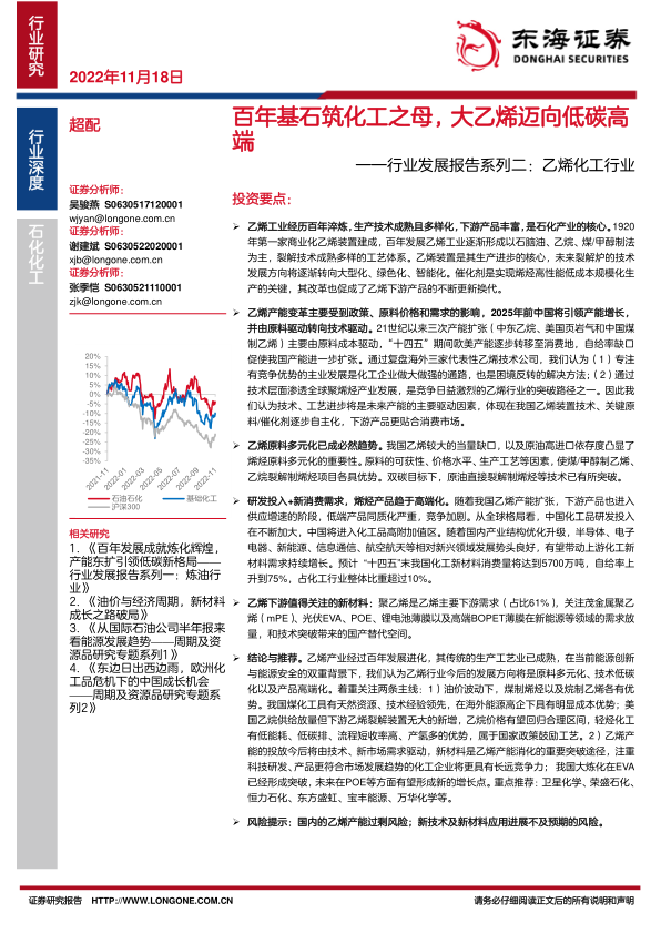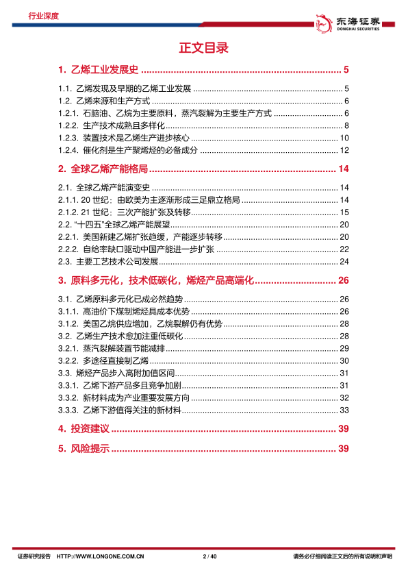风险提示:国内的乙烯产能过剩风险;新技术及新材料应用进展不及预期的风险。
