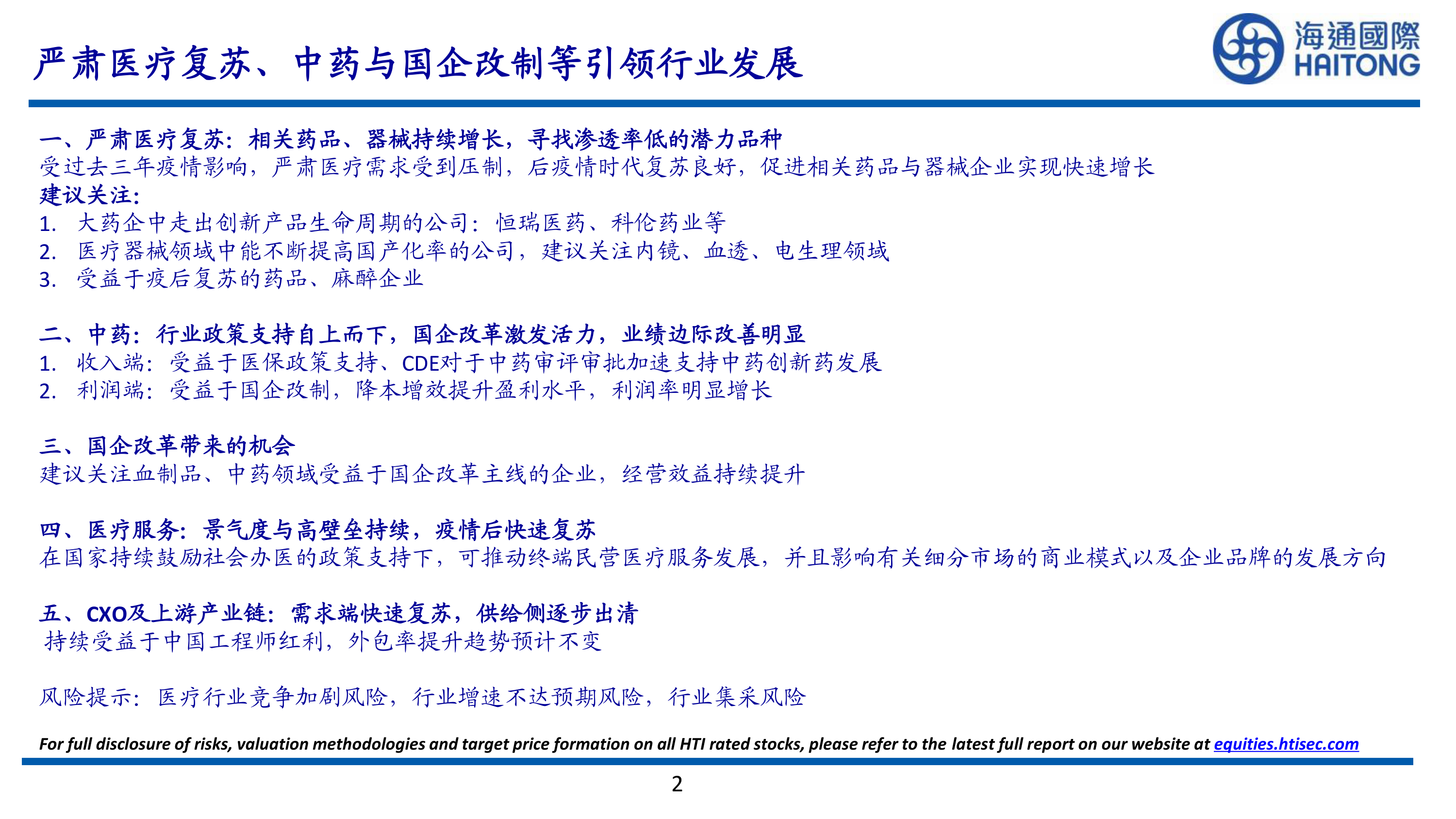 报告强调,在当前市场环境下,寻找确定性的细分赛道成长是关键。医疗服务领域凭借其高景气度和高壁垒,在疫情后迅速恢复,民营医疗服务发展空间广阔。CXO及上游产业链虽然短期受到生物医药投融资“寒冬”的影响,但长期来看,中国工程师红利和全球外包率提升的趋势不变,头部企业凭借其规模和能力优势,有望在供给侧出清后实现市场份额的进一步提升。报告同时提示了行业竞争加剧、增速不及预期及集采等潜在风险,建议投资者关注具备α属性的优质公司。