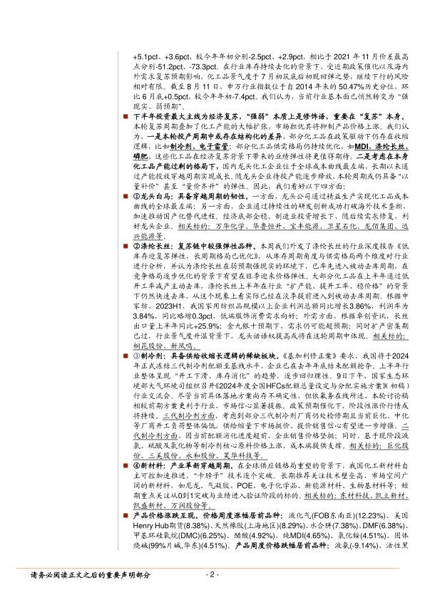 本报告对化工行业23W32周度观点进行了深入分析,核心在于制冷剂行业景气周期开启在即,得益于三代配额政策的落地预期和供需格局的优化,HFCs价格有望迎来弹性增长。同时,化工品景气度已于7月初筑底回弹,尽管年初至今板块表现落后大盘,但随着国内外需求复苏和政策催化,行业下行风险有限。