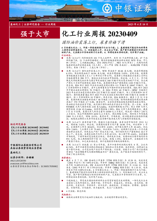 本周(4.3-4.7)国际油价震荡上行,WTI原油收于80.46美元/桶,收盘价周涨幅6.15%;布伦特原油收于84.94美元/桶,收盘价周涨幅5.05%。宏观方面,美国商务部数据显示美国2月工厂订单环比下降0.7%,美国劳工部数据显示美国2月职位空缺数量降至990万个,制造业活动与就业市场放缓。供应端,4月2日,多个欧佩克及非欧佩克组织参与国宣布实施超过160万桶/日的自愿石油减产计划,本次减产将从5月份开始持续至2023年底。美国国内原油产量维持在1220万桶/日不变。需求端,EIA预计2023年全球石油需求同比增加111万桶/日至10047万桶/日,较1月预估增加6万桶/日,其中主要增量来自中国和非经合组织国家,EIA预计2023年中国石油需求将增加70万桶/日,在2024年增加40万桶/日;OPEC月报预计2023年全球石油需求同比增加232万桶/日至10187万桶/日,较1月预估增加10万桶/日;国际能源署IEA预计2023年全球石油需求同比增加190万桶/日至10190万桶/日,较1月预估增加10万桶/日。库存方面,EIA数据显示,截至3月31日当周,美国战略石油储备库存减少40万桶至3.712亿桶,除却战略储备的商业原油库存减少370万桶至4.7亿桶。展望后市,全球经济增速放缓或抑制原油需求增长,原油供应仍存在收窄可能,我们预计国际油价在中高位水平震荡。另一方面,本周NYMEX天然气期货收报2.04美元/mbtu,收盘价周跌幅8.17%;荷兰TTF天然气期货收报13.84美元/mbtu,结算价周涨幅1.99%。EIA天然气库存周报显示,截至3月31日当周,美国天然气库存总量为18300亿立方英尺,较此前一周减少230亿立方英尺,较去年同期增加4430亿立方英尺,同比增幅31.9%,同时较5年均值高2980亿立方英尺,增幅19.5%。展望后市,中期来看,欧洲能源供应结构依然脆弱,地缘政治博弈以及季节性需求波动都可能导致天然气价格剧烈宽幅震荡。