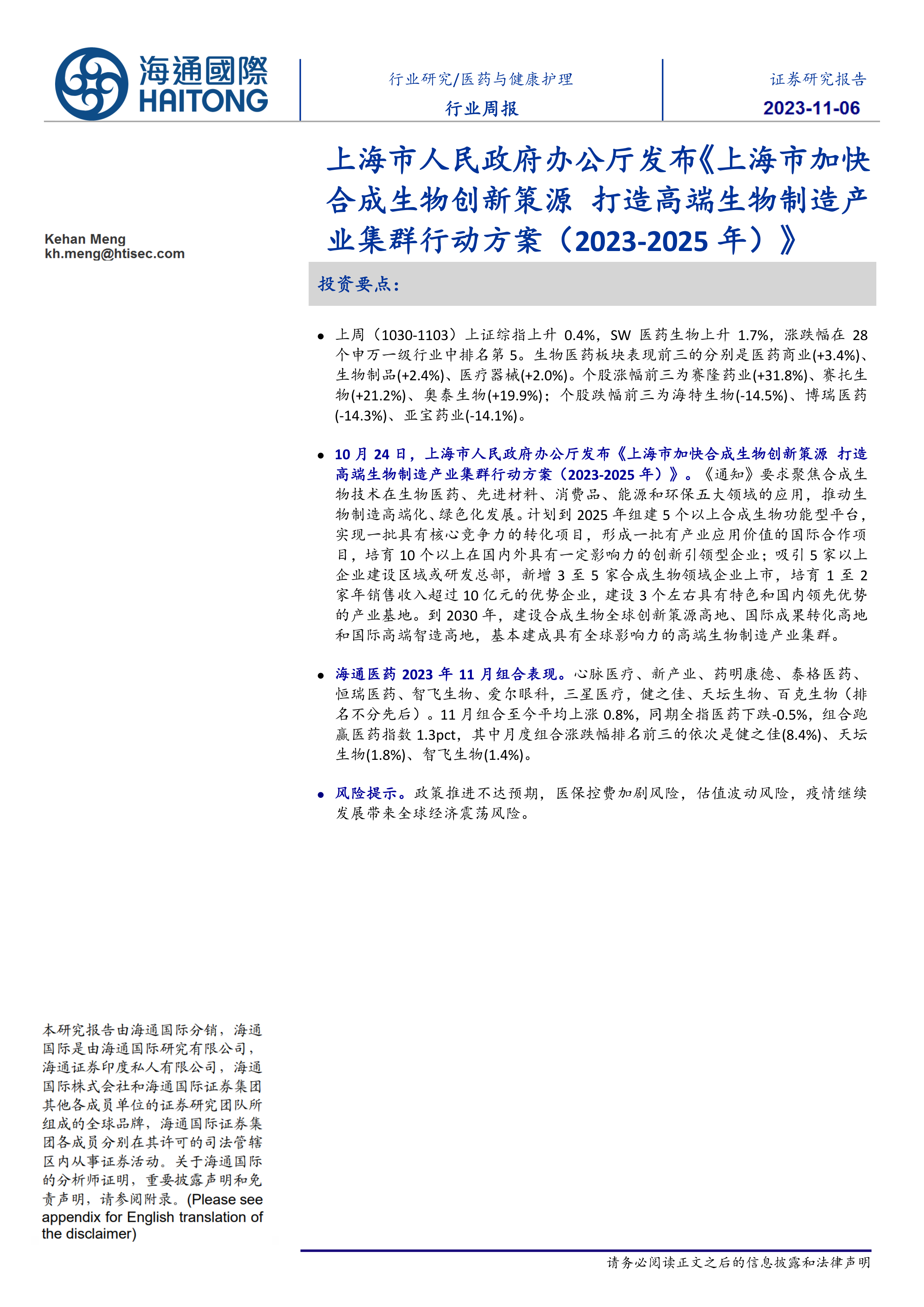本报告分析了上周医药生物板块的市场表现,并重点关注了上海市发布的合成生物产业集群行动方案。同时,报告也展示了海通医药11月组合的表现,并提示了相关风险。