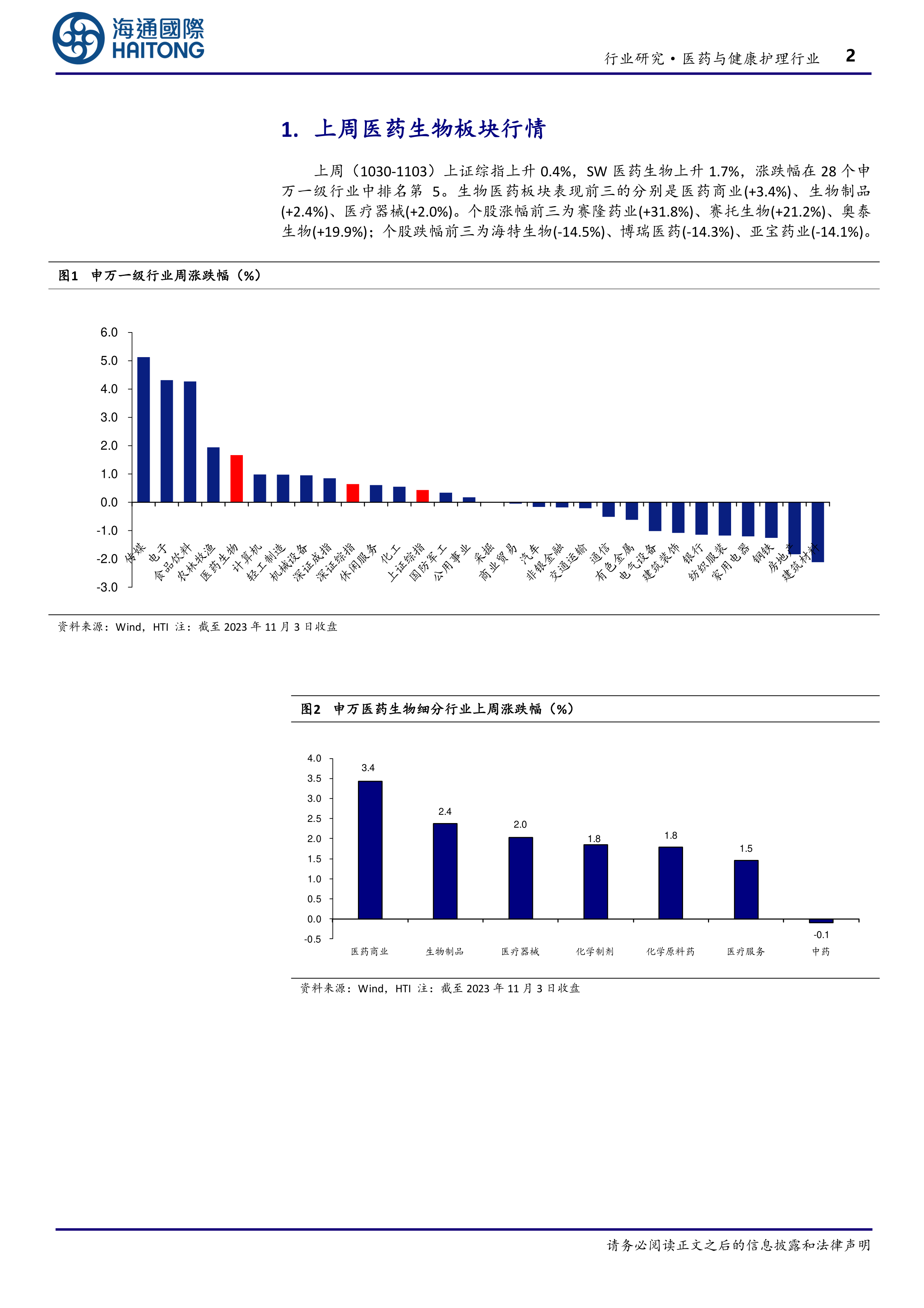 上周(1030-1103)上证综指上升0.4%,SW医药生物上升1.7%,涨跌幅在28个申万一级行业中排名第5。生物医药板块表现前三的分别是医药商业(+3.4%)、生物制品(+2.4%)、医疗器械(+2.0%)。个股涨幅前三为赛隆药业(+31.8%)、赛托生物(+21.2%)、奥泰生物(+19.9%);个股跌幅前三为海特生物(-14.5%)、博瑞医药(-14.3%)、亚宝药业(-14.1%)。