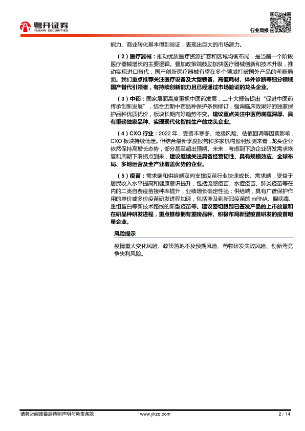 (3)中药:国家层面高度重视中医药发展,二十大报告提出“促进中医药传承创新发展”,结合近期中药品种保护条例修订,强调临床效果好的独家保护品种优质优价,板块长期向好趋势不变。建议重点关注中医药底蕴深厚、具有重磅独家品种、实现现代化智能生产的龙头企业。