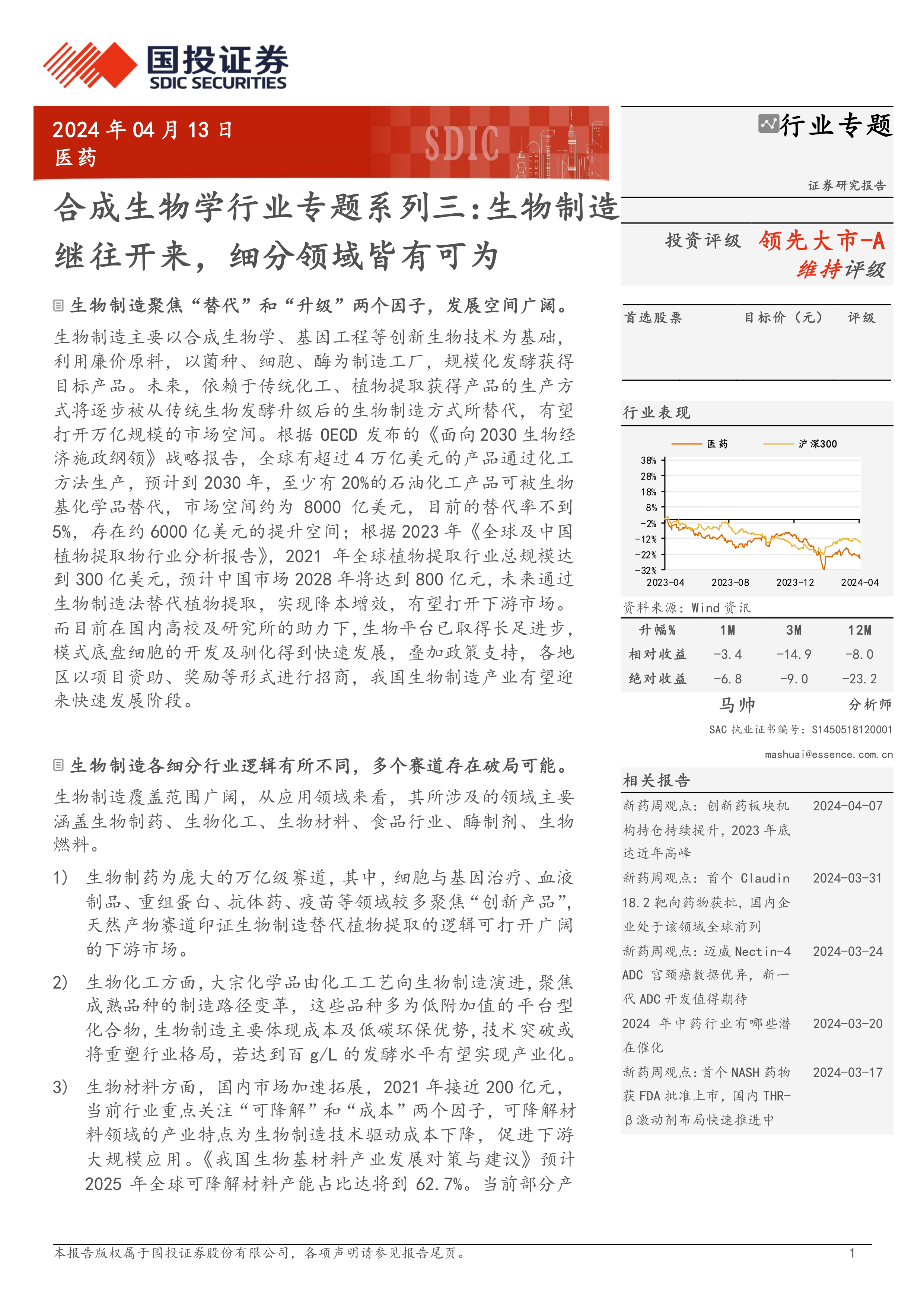 合成生物学行业专题系列三:生物制造继往开来,细分领域皆有可为