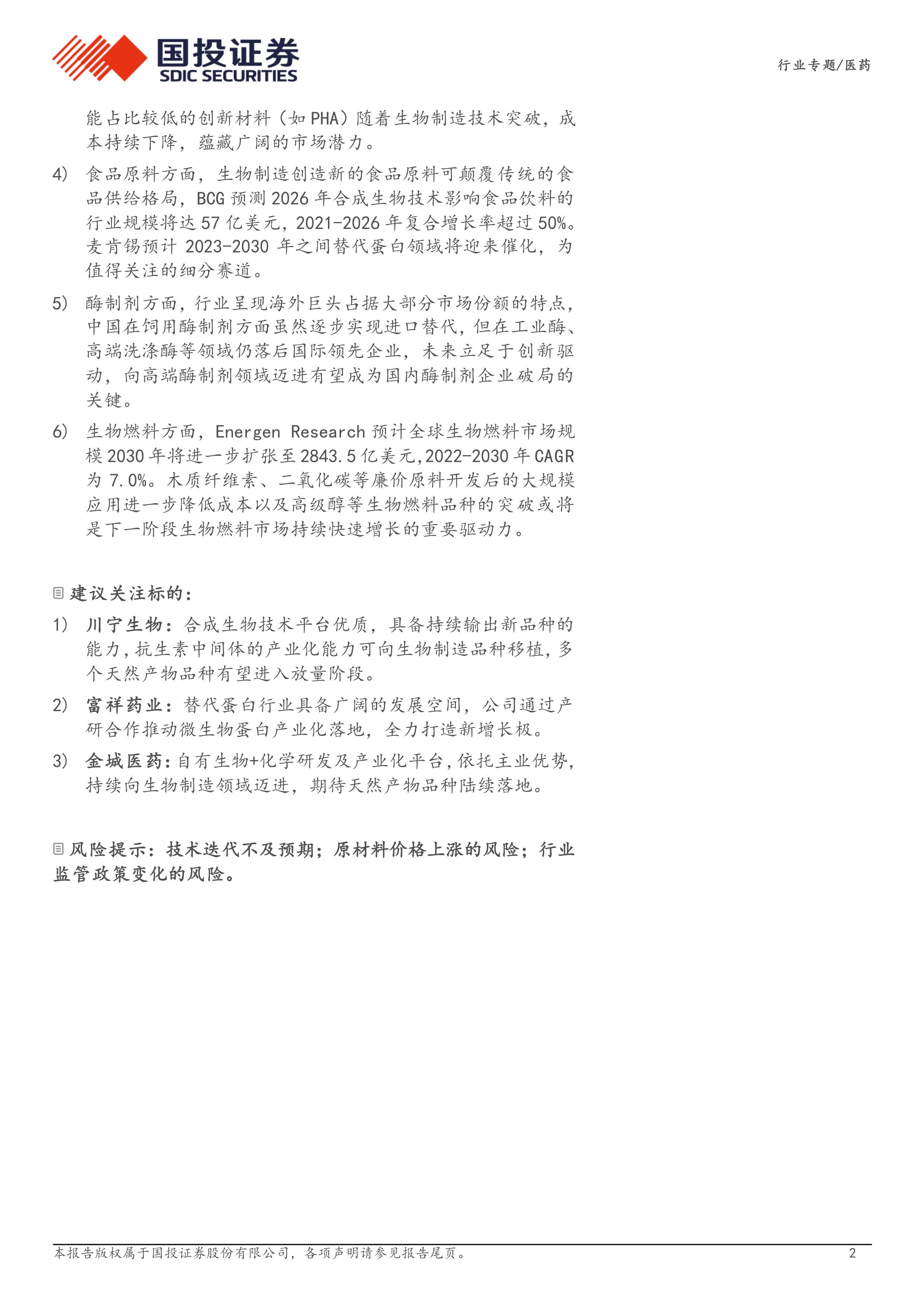 同时,报告提示了生物制造行业面临的风险,包括技术迭代不及预期、原材料价格上涨的风险(目前仍依赖淀粉、蔗糖等粮食来源原料)以及行业监管政策变化的风险(涉及多个主管部门,可能出台限制性规定)。