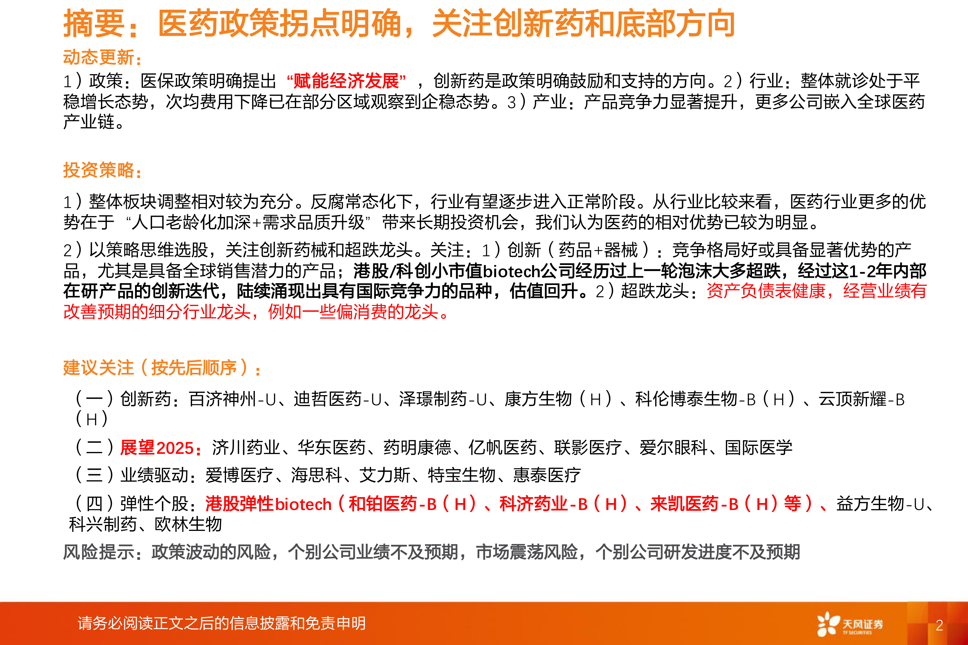 1)政策:医保政策明确提出“赋能经济发展”,创新药是政策明确鼓励和支持的方向。2)行业:整体就诊处于平稳增长态势,次均费用下降已在部分区域观察到企稳态势。3)产业:产品竞争力显著提升,更多公司嵌入全球医药产业链。