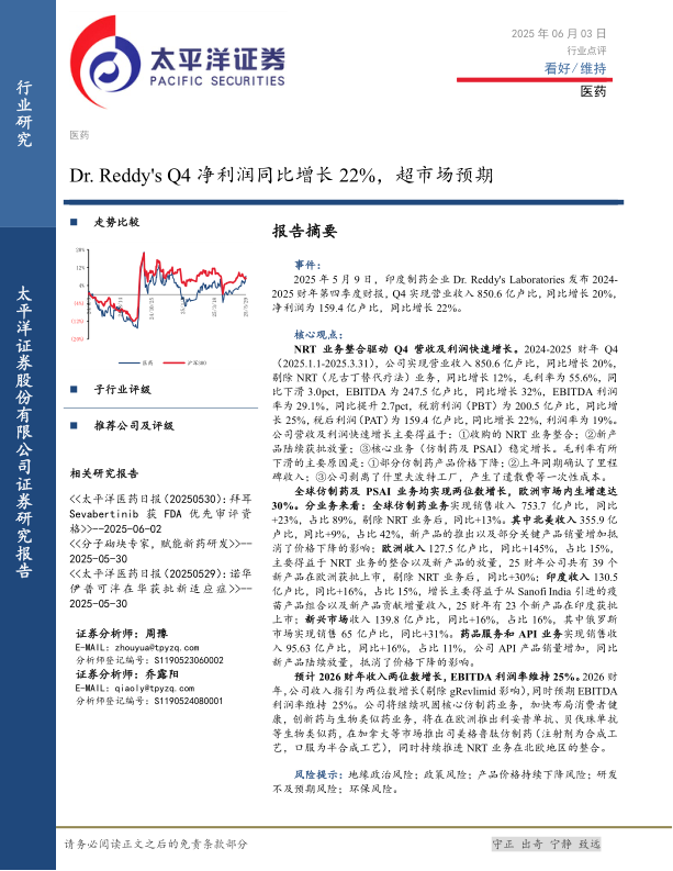 Dr. Reddy's Laboratories在2024-2025财年第四季度表现出色,营业收入和净利润均实现显著的两位数增长,超出市场预期。这一强劲业绩主要得益于NRT业务的成功整合、新产品的持续市场放量以及核心仿制药和PSAI业务的稳健增长。尽管面临部分仿制药价格下降和一次性成本导致的毛利率小幅下滑,公司通过有效的运营管理,EBITDA利润率仍实现了提升。展望未来,公司对2026财年持乐观态度,预计将保持两位数的收入增长,并积极拓展生物类似药、创新药和消费者健康等高增长领域,以实现可持续发展。同时,报告也审慎提示了地缘政治、政策、产品价格下降、研发和环保等多方面的潜在风险,为投资者提供了全面的分析视角。