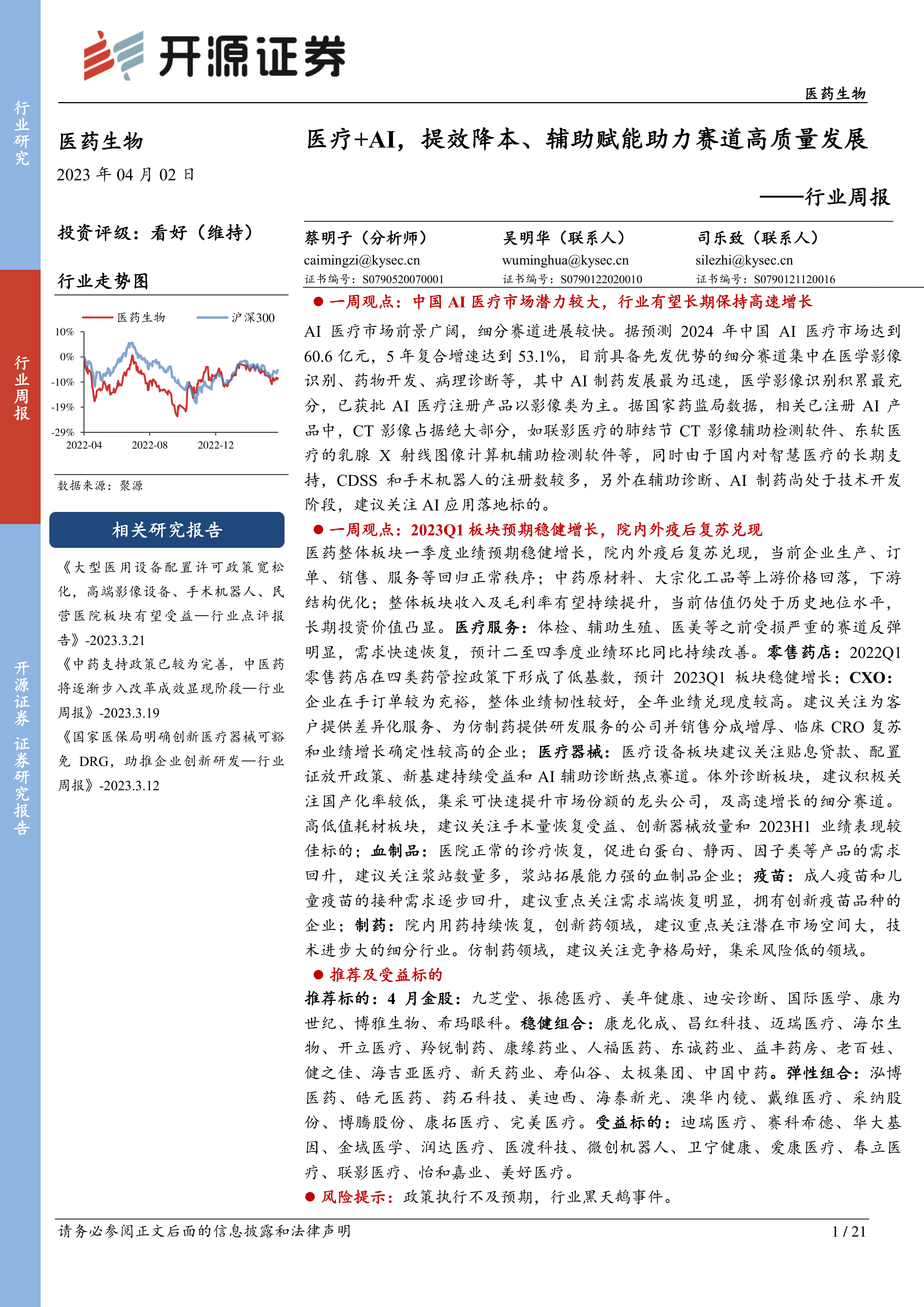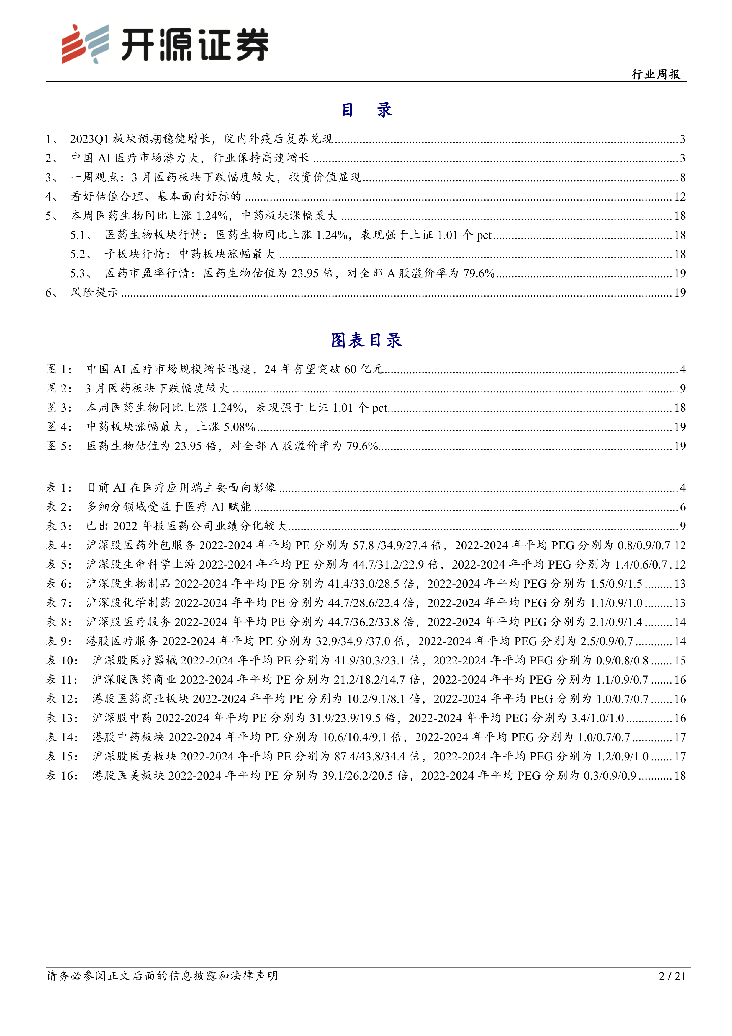 本报告深入分析了医药生物行业的当前发展态势与未来前景,核心观点聚焦于AI技术对医疗行业的革命性推动作用以及疫后医药板块的稳健复苏。中国AI医疗市场潜力巨大,预计到2024年将达到60.6亿元,年复合增长率高达53.1%,医学影像识别和药物开发是当前AI应用最成熟且最具潜力的细分领域。2023年第一季度,医药整体板块业绩预期稳健增长,院内外诊疗活动强劲反弹,各细分领域如医疗服务、零售药店、CXO、医疗器械、血制品、疫苗和制药均呈现出明确的复苏态势和结构性投资机会。尽管3月医药板块经历回调,但当前行业估值处于历史低位,长期投资价值凸显。报告详细梳理了各细分板块的估值水平,并推荐了一系列在AI应用、疫后复苏及创新成长方面具备潜力的优质标的。投资者应关注政策执行不及预期及行业黑天鹅事件等风险。