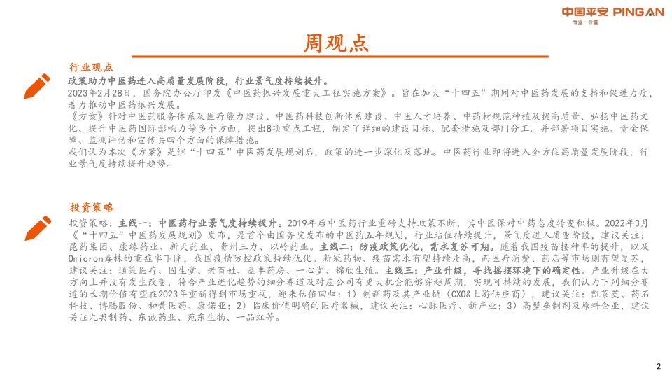 投资策略:主线一:中医药行业景气度持续提升。2019年后中医药行业重磅支持政策不断,其中医保对中药态度转变积极。2022年3月《“十四五”中医药发展规划》发布,是首个由国务院发布的中医药五年规划,行业站位持续提升,景气度进入质变阶段,建议关注:昆药集团、康缘药业、新天药业、贵州三力、以岭药业。主线二:防疫政策优化,需求复苏可期。随着我国疫苗接种率的提升,以及Omicron毒株的重症率下降,我国疫情防控政策持续优化。新冠药物、疫苗需求有望持续走高,而医疗消费、药店等市场则有望复苏,建议关注:通策医疗、固生堂、老百姓、益丰药房、一心堂、锦欣生殖。主线三:产业升级,寻找摇摆环境下的确定性。产业升级在大方向上并没有发生改变,符合产业进化趋势的细分赛道及对应公司有更大机会能够穿越周期,实现可持续的发展,我们认为下列细分赛道的长期价值有望在2023年重新得到市场重视,迎来估值回归:1)创新药及其产业链(CXO&上游供应商),建议关注:凯莱英、药石科技、博腾股份、和黄医药、康诺亚;2)临床价值明确的医疗器械,建议关注:心脉医疗、新产业;3)高壁垒制剂及原料企业,建议关注九典制药、东诚药业、苑东生物、一品红等。