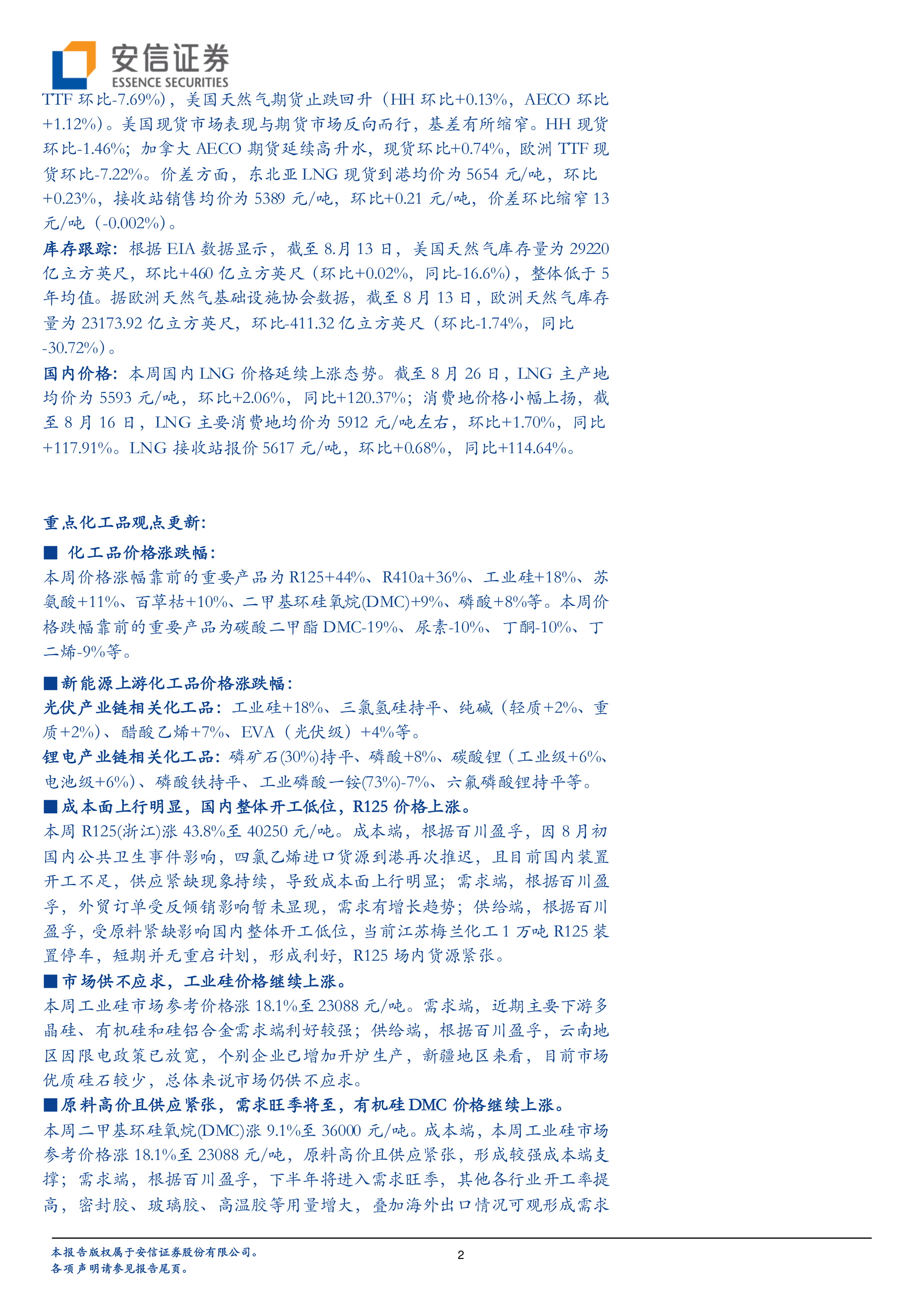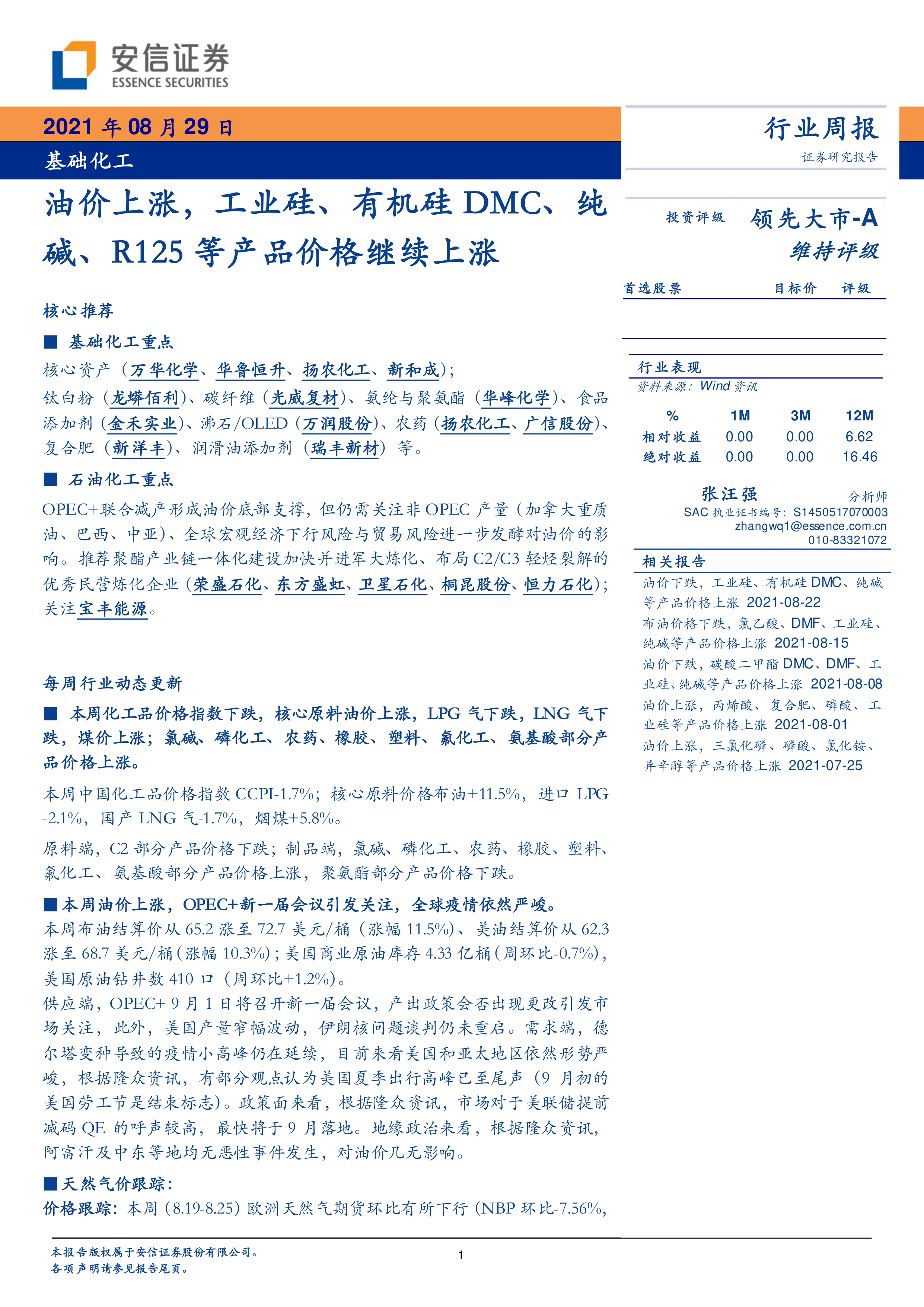 本报告分析了2021年8月29日当周基础化工行业的市场动态,重点关注了油价上涨背景下,工业硅、有机硅DMC、纯碱、R125等产品价格的持续上涨现象。报告通过对化工品价格指数、原料价格、以及重点化工品价格涨跌幅的分析,揭示了成本、供需等多重因素对化工品价格的影响。