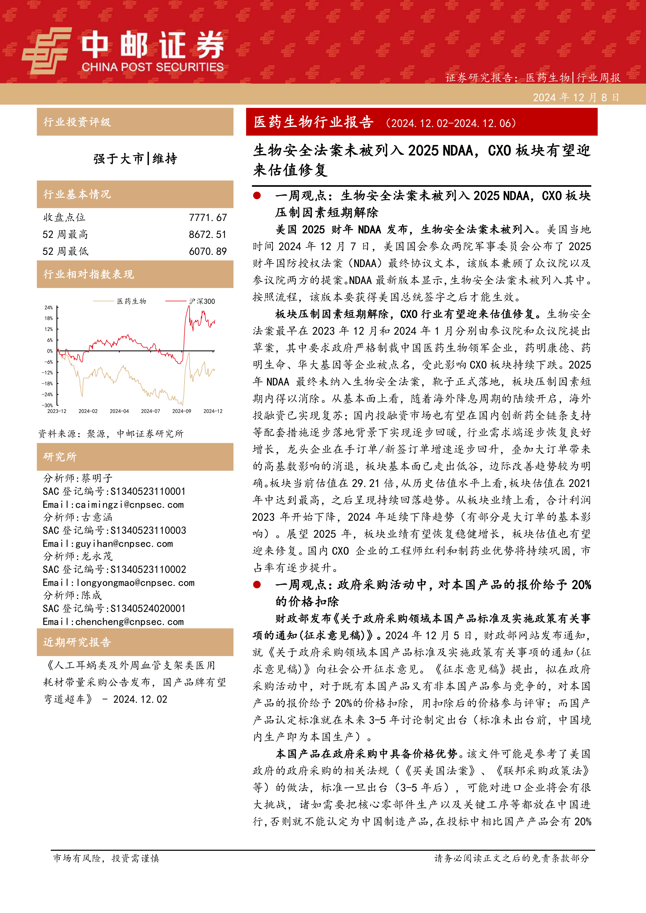 医药生物行业报告:生物安全法案未被列入2025 NDAA,CXO板块有望迎来估值修复