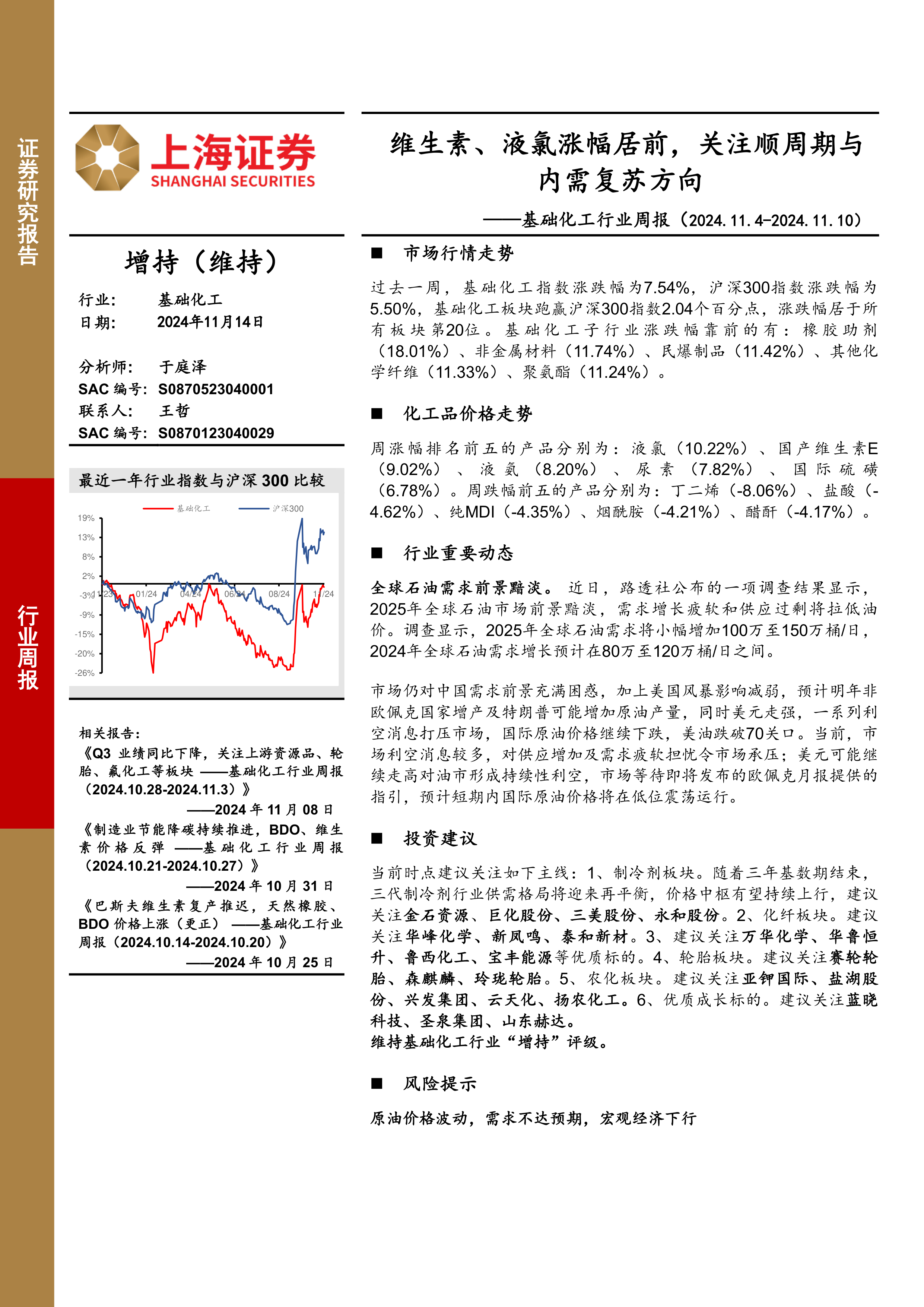 基础化工行业周报:维生素、液氯涨幅居前,关注顺周期与内需复苏方向
