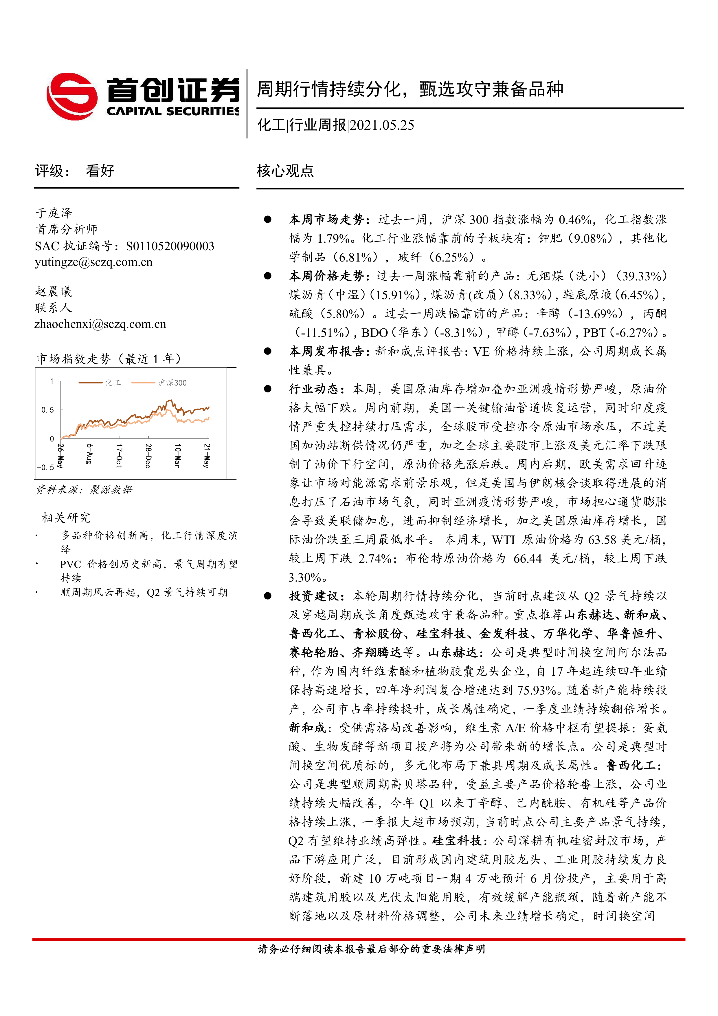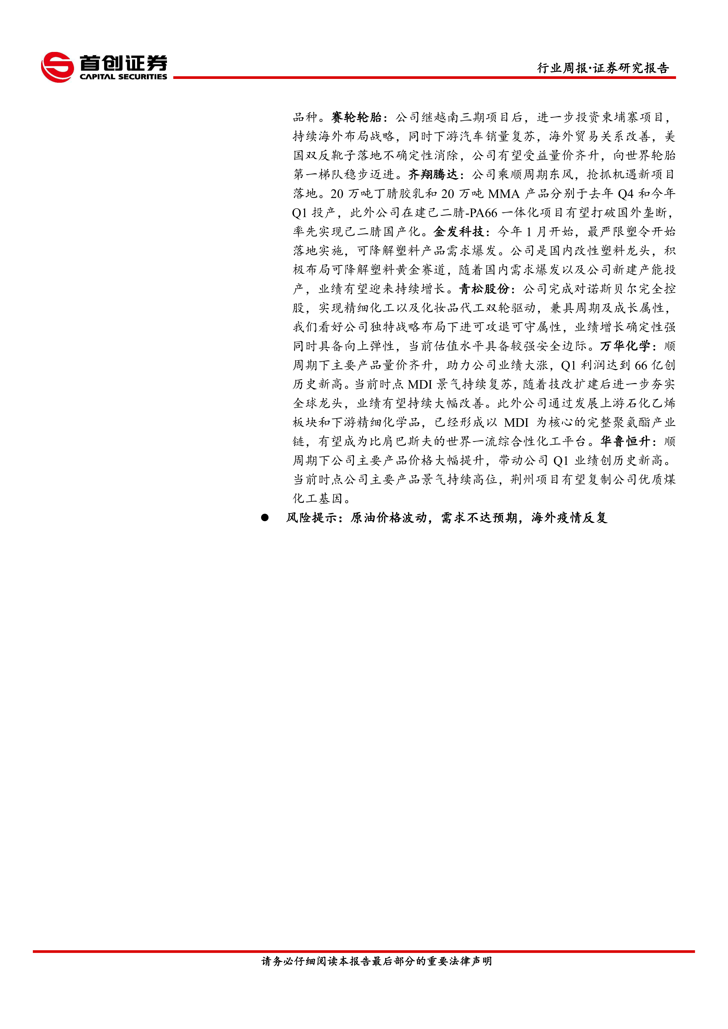 投资建议:本轮周期行情持续分化,当前时点建议从Q2景气持续以及穿越周期成长角度甄选攻守兼备品种。重点推荐山东赫达、新和成、鲁西化工、青松股份、硅宝科技、金发科技、万华化学、华鲁恒升、赛轮轮胎、齐翔腾达等。山东赫达:公司是典型时间换空间阿尔法品种,作为国内纤维素醚和植物胶囊龙头企业,自17年起连续四年业绩保持高速增长,四年净利润复合增速达到75.93%。随着新产能持续投产,公司市占率持续提升,成长属性确定,一季度业绩持续翻倍增长。新和成:受供需格局改善影响,维生素A/E价格中枢有望提振;蛋氨酸、生物发酵等新项目投产将为公司带来新的增长点。公司是典型时间换空间优质标的,多元化布局下兼具周期及成长属性。鲁西化工:公司是典型顺周期高贝塔品种,受益主要产品价格轮番上涨,公司业绩持续大幅改善,今年Q1以来丁辛醇、己内酰胺、有机硅等产品价格持续上涨,一季报大超市场预期,当前时点公司主要产品景气持续,Q2有望维持业绩高弹性。硅宝科技:公司深耕有机硅密封胶市场,产品下游应用广泛,目前形成国内建筑用胶龙头、工业用胶持续发力良好阶段,新建10万吨项目一期4万吨预计6月份投产,主要用于高端建筑用胶以及光伏太阳能用胶,有效缓解产能瓶颈,随着新产能不断落地以及原材料价格调整,公司未来业绩增长确定,时间换空间品种。赛轮轮胎:公司继越南三期项目后,进一步投资柬埔寨项目,持续海外布局战略,同时下游汽车销量复苏,海外贸易关系改善,美国双反靴子落地不确定性消除,公司有望受益量价齐升,向世界轮胎第一梯队稳步迈进。齐翔腾达:公司乘顺周期东风,抢抓机遇新项目落地。20万吨丁腈胶乳和20万吨MMA产品分别于去年Q4和今年Q1投产,此外公司在建己二腈-PA66一体化项目有望打破国外垄断,率先实现己二腈国产化。金发科技:今年1月开始,最严限塑令开始落地实施,可降解塑料产品需求爆发。公司是国内改性塑料龙头,积极布局可降解塑料黄金赛道,随着国内需求爆发以及公司新建产能投产,业绩有望迎来持续增长。青松股份:公司完成对诺斯贝尔完全控股,实现精细化工以及化妆品代工双轮驱动,兼具周期及成长属性,我们看好公司独特战略布局下进可攻退可守属性,业绩增长确定性强同时具备向上弹性,当前估值水平具备较强安全边际。万华化学:顺周期下主要产品量价齐升,助力公司业绩大涨,Q1利润达到66亿创历史新高。当前时点MDI景气持续复苏,随着技改扩建后进一步夯实全球龙头,业绩有望持续大幅改善。此外公司通过发展上游石化乙烯板块和下游精细化学品,已经形成以MDI为核心的完整聚氨酯产业链,有望成为比肩巴斯夫的世界一流综合性化工平台。华鲁恒升:顺周期下公司主要产品价格大幅提升,带动公司Q1业绩创历史新高。当前时点公司主要产品景气持续高位,荆州项目有望复制公司优质煤化工基因。
