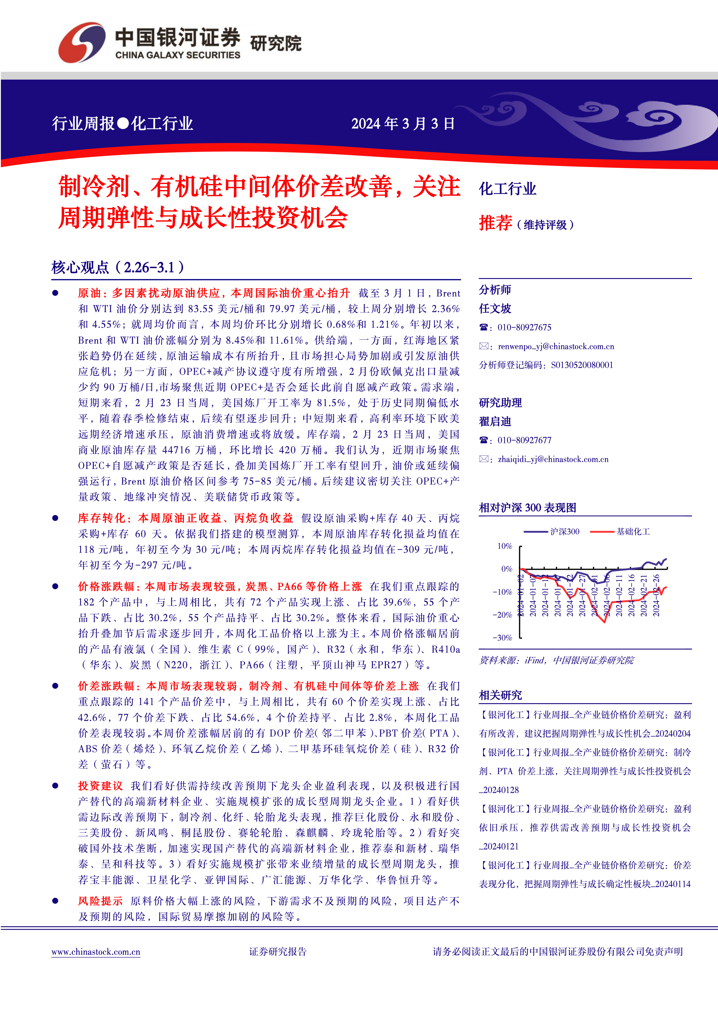 化工行业周报:制冷剂、有机硅中间体价差改善,关注周期弹性与成长性投资机会