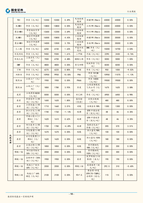 本周市场优化平均市盈率为18.90。国金基础化工指数录得2847点,沪深300指数为3968点,上证指数为2968点,深证成指为10005点,中小板综指为9293点。上周布伦特期货结算均价为35.37美元/桶,环比上涨0.62美元/桶,涨幅达1.78%;WTI期货结算均价为33.57美元/桶,环比上涨1.44美元/桶,涨幅达4.5%。尽管原油价格仍处于低位,但本周呈现出小幅回升的态势,这为部分化工产品提供了边际成本支撑,但整体低位震荡的格局仍对产业链构成不确定性。