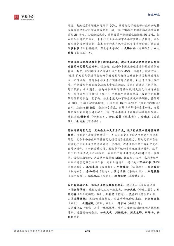 我们看好磷化工一体化企业的长期投资机会。建议关注三条投资主线: