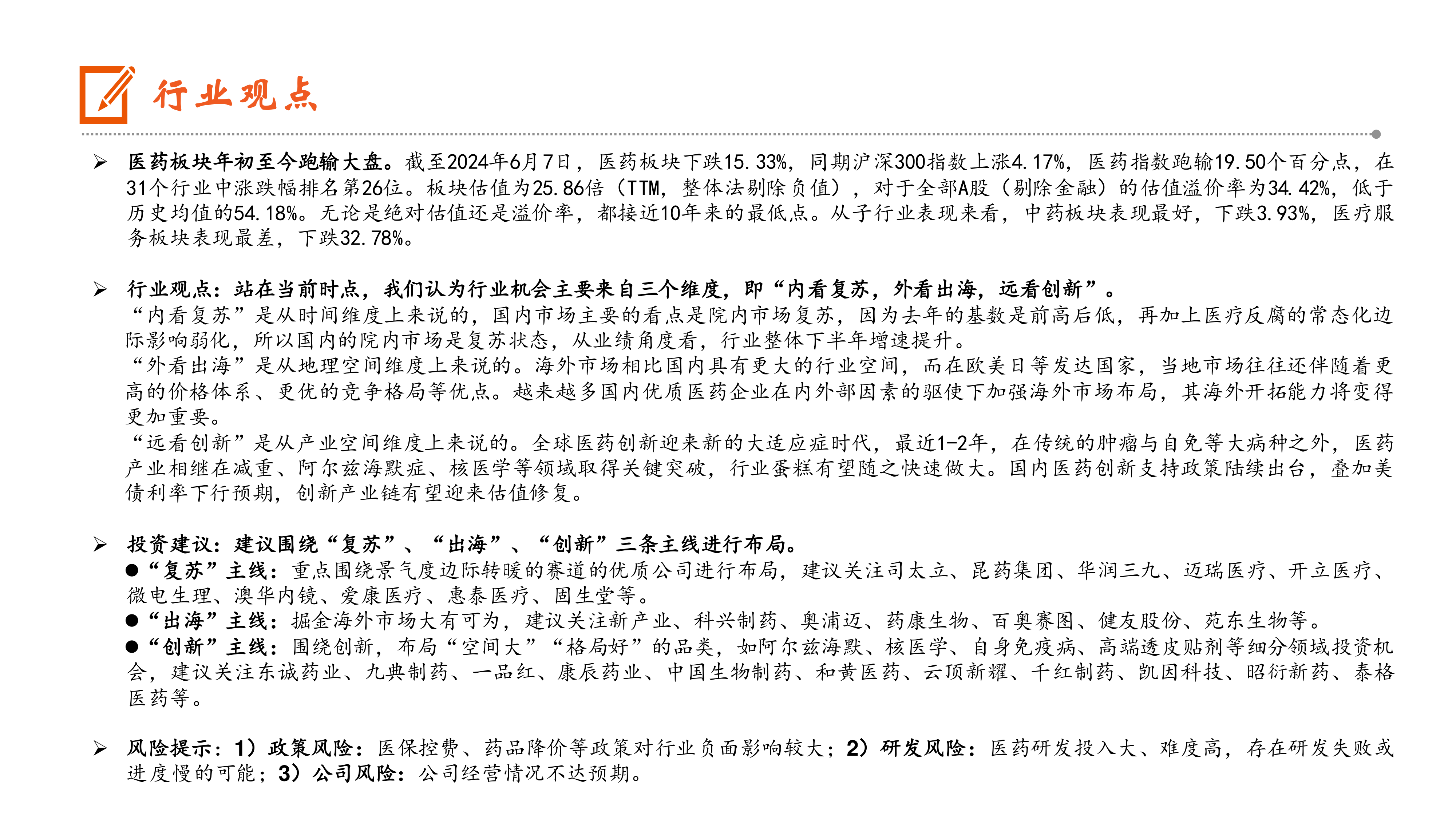 本报告对医药行业2024年中期策略进行了全面而专业的分析,明确指出当前行业正处于“内看复苏、外看出海、远看创新”的关键转型期。尽管医药板块年初至今表现不佳且估值处于历史低位,但多重积极因素正在积聚,预示着行业有望迎来估值修复和业绩增长。
