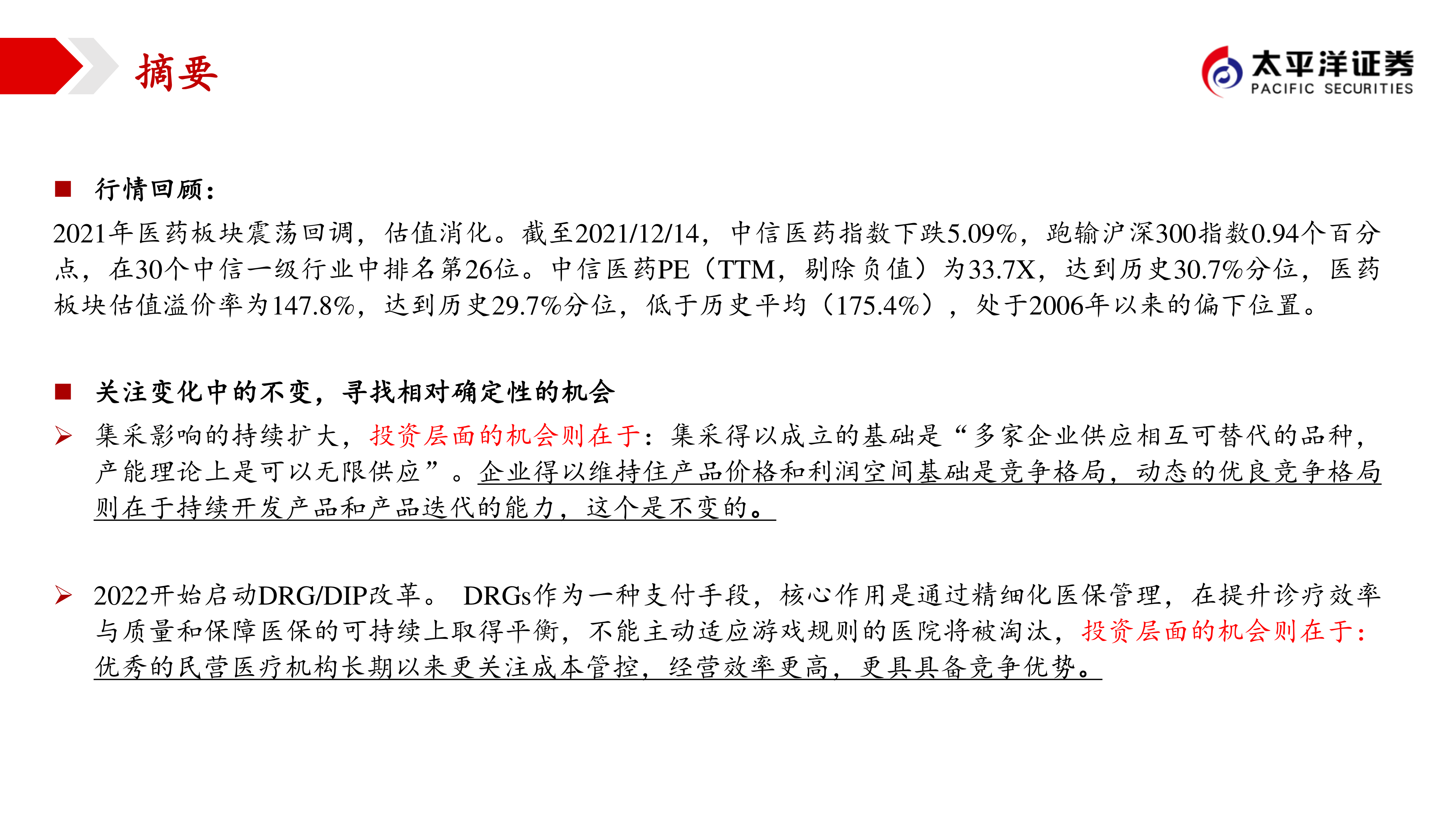 2021年医药板块在政策压制和市场风格切换下经历震荡回调和估值消化,但其估值溢价率已处于历史偏下位置,投资性价比有所提升。展望2022年,报告建议投资者应着眼于行业“变化中的不变”的核心逻辑,即人口老龄化带来的医疗需求增长、医保基金可持续发展的压力以及国内医药产业制造升级和国际化进程加快的趋势。